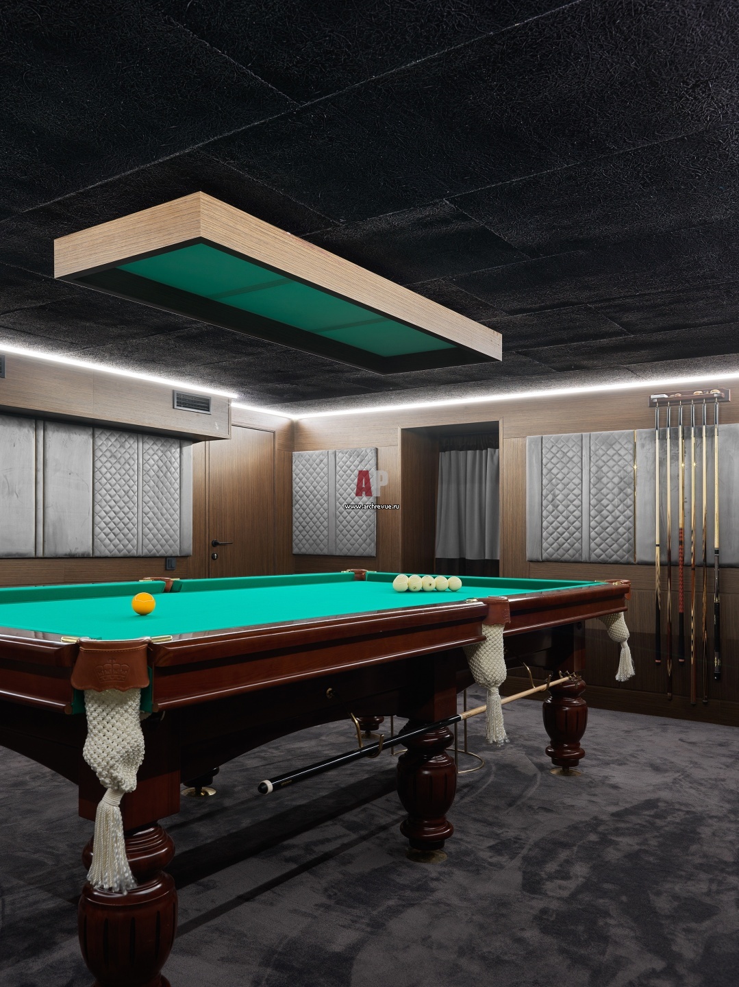 Бильярдная в цокольном этаже. На стенах – панели из эвкалипта в сочетании с панелями из замши со вставками из латуни. При разработке панелей автор проекта вдохновлялась дизайном салонов спортивных автомобилей.