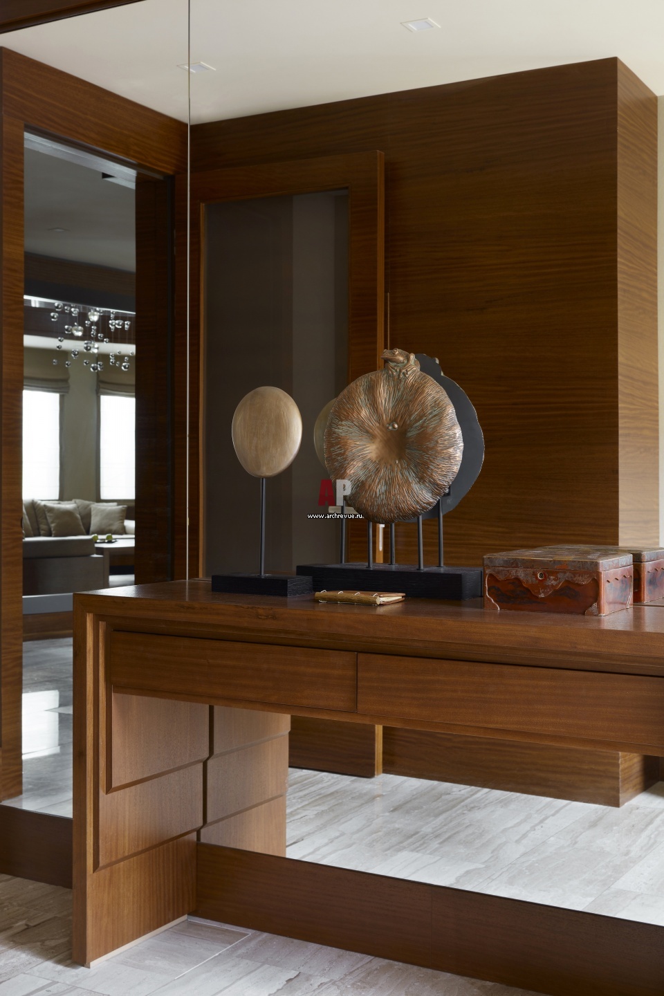Рациональный дом в стиле современной яхты. Консоль из тика сделана на заказ.