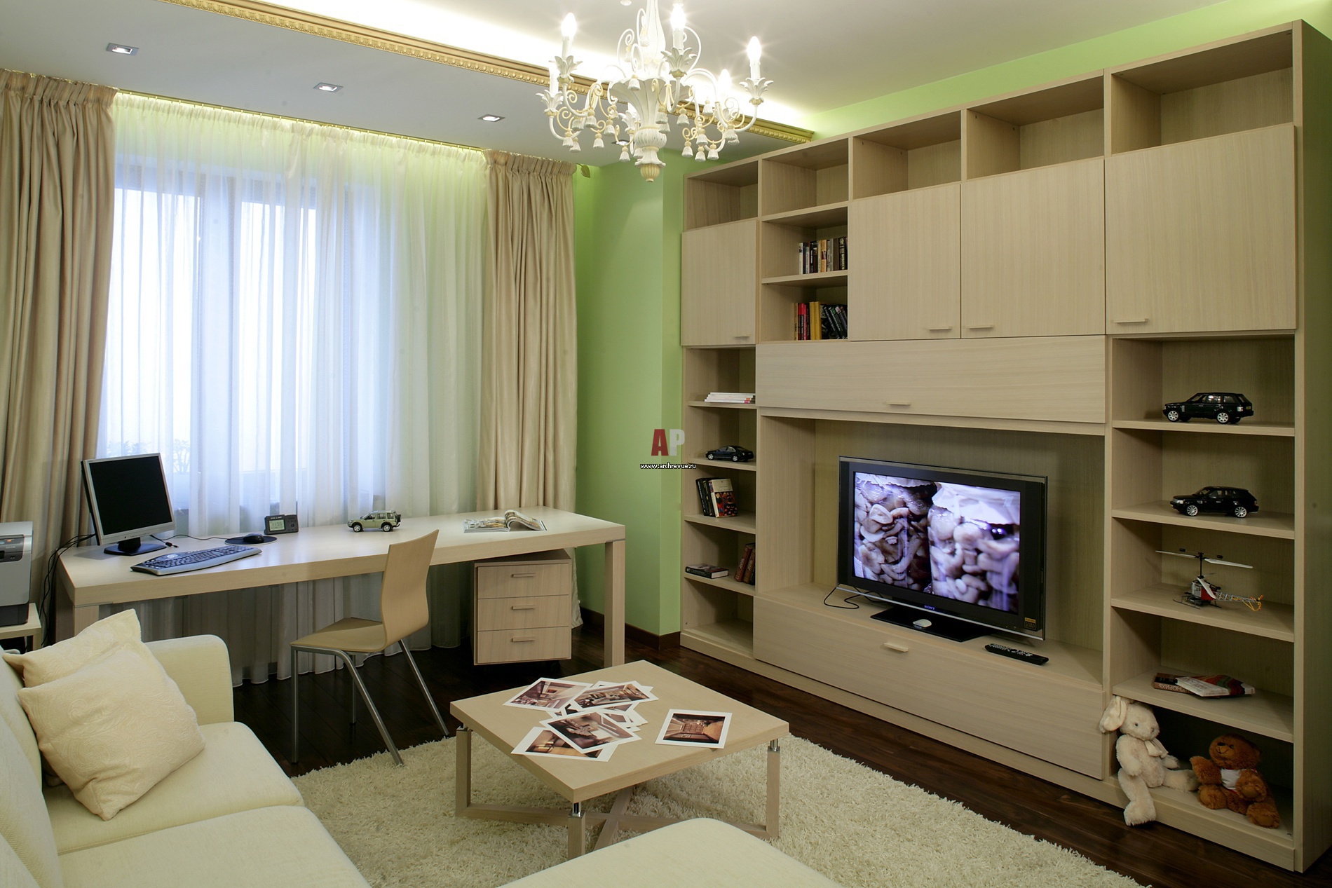 Детская в современном стиле решена в легких пастельных тонах. Стены выкрашены в зеленый цвет. Мебель из выбеленного дуба Poliform.