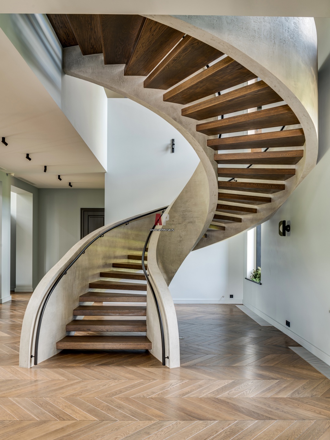 Винтовая железобетонная лестница со сквозными подступенками – настоящий арт-объект. Лекальная конструкция выполнена по эскизам авторов проекта.