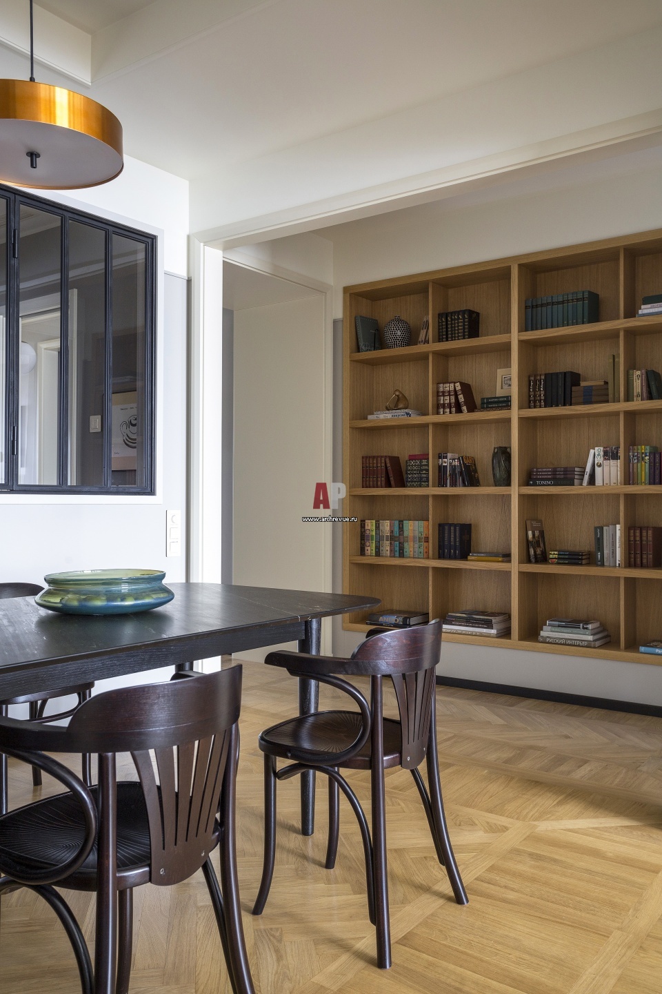 Встроенный библиотечный стеллаж в гостиной сделан на заказ из дуба. На полу – штучный паркет из романовского дуба.