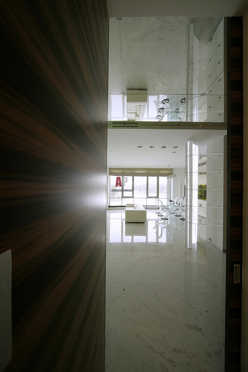 Вид из прихожей на объединенную гостиную-столовую. Потолки в зоне входа сделаны зеркальными. Вместе со стеклянной колонной они увеличивают высоту и площадь помещения.