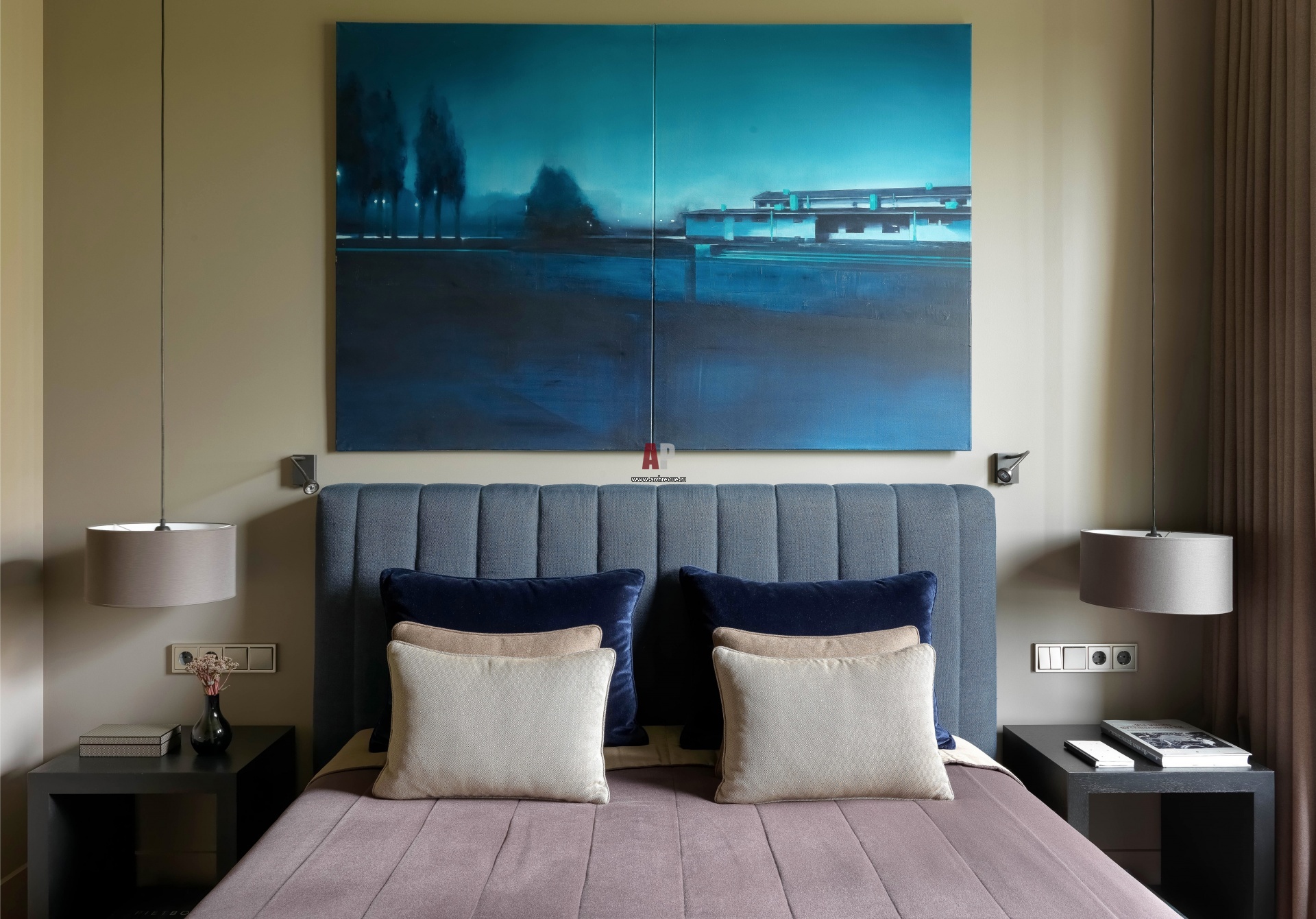 Квартира с террасой в ближайшем Подмосковье. Интерьер спальни. Кровать с текстильным изголовьем, Meridiani. Прикроватные тумбы, шпон дуба, на заказ. Светильники, Stephane Davidts. Картина на стене – художник Светлана Иконен.