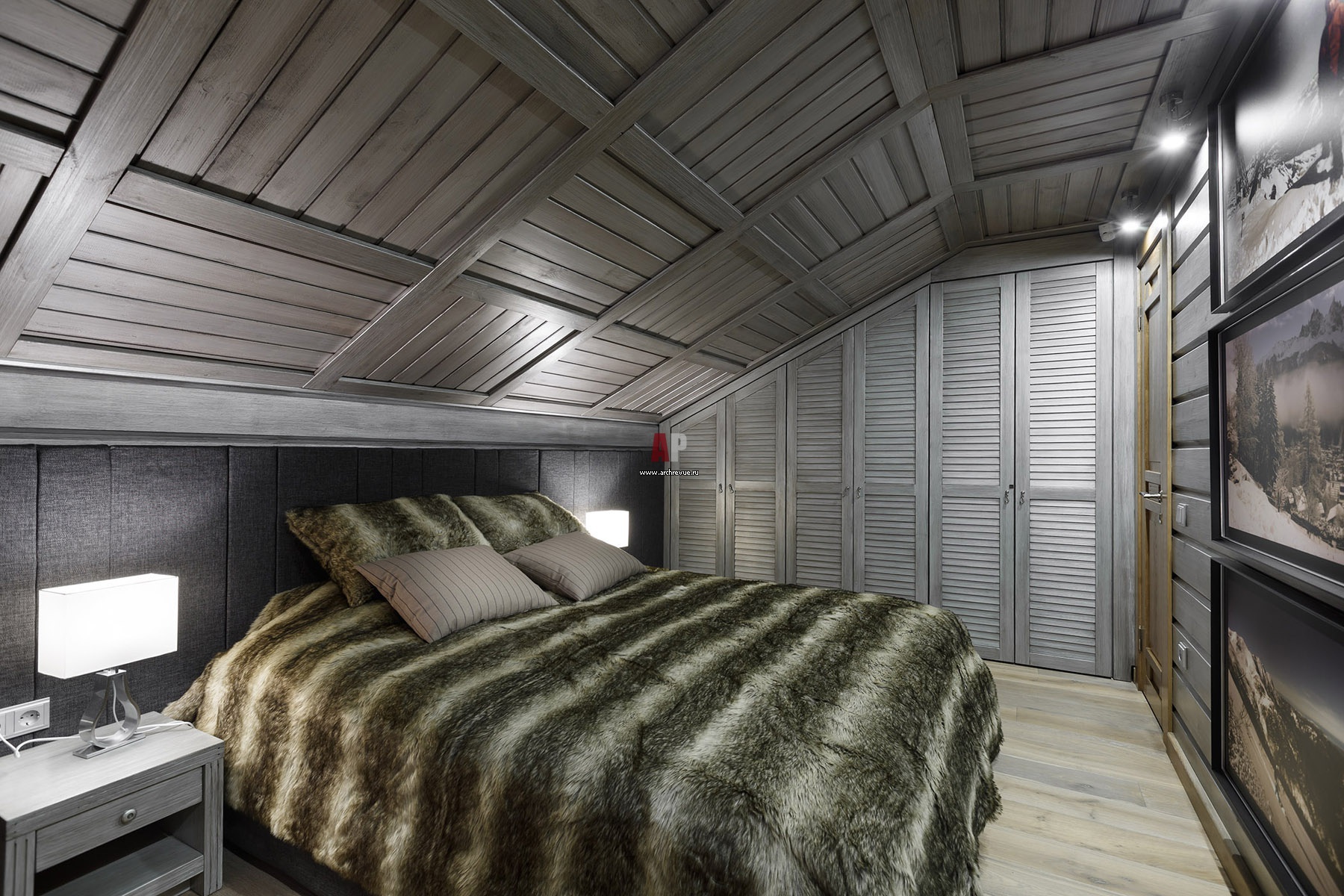 Потолок спальни подшит квадратными деревянными модулями, темнее основного цвета стен. Кровать, Invetro. Встроенный шкаф в яхтенном стиле выкрашен в один тон со стенами.
