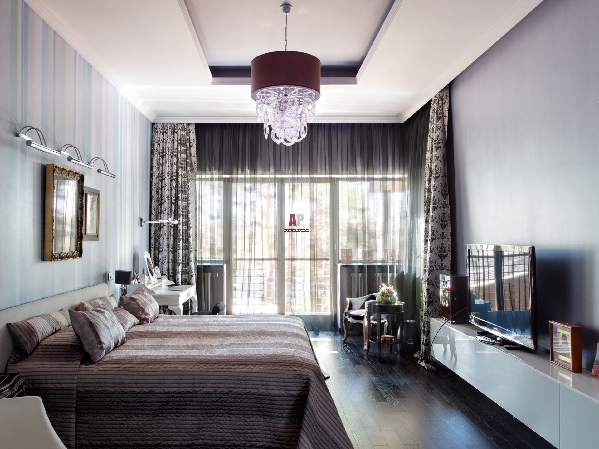 Интерьер спальни в современном стиле. Темный пол оттеняет светлые стены и нейтральную мебель. Ставка сделана на панорамное окно, откуда видна первозданная природа.
