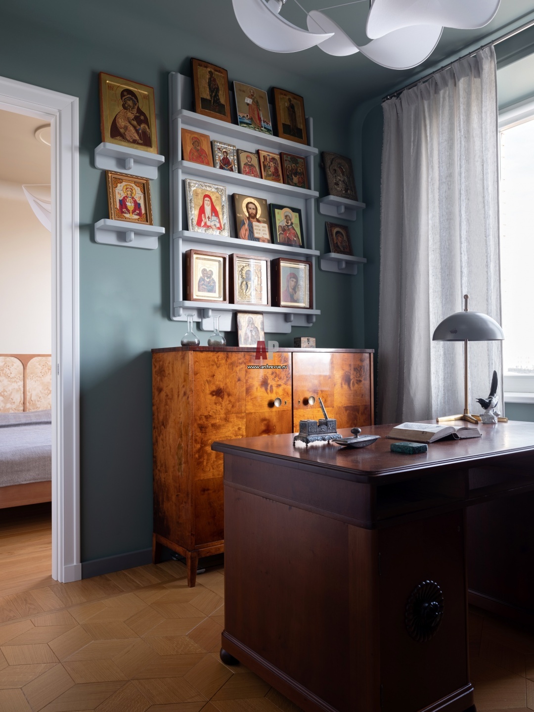 Кабинет смежный со спальней. Комод, Nils Erikssons Mobelfabrik, винтаж, Швеция, 1940-е гг. Стеллаж для коллекции икон изготовлен на заказ.