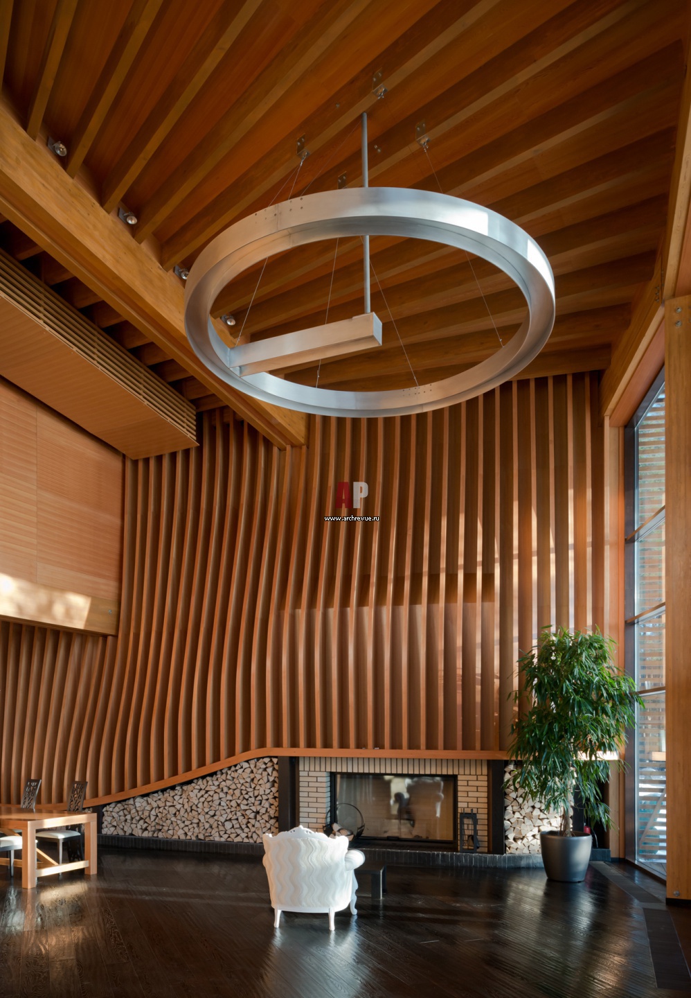 Каминный зал освещает люстра-кольцо диаметром 3 метра. Она сделана по эскизам из алюминия и закреплена на стальных тросах.
