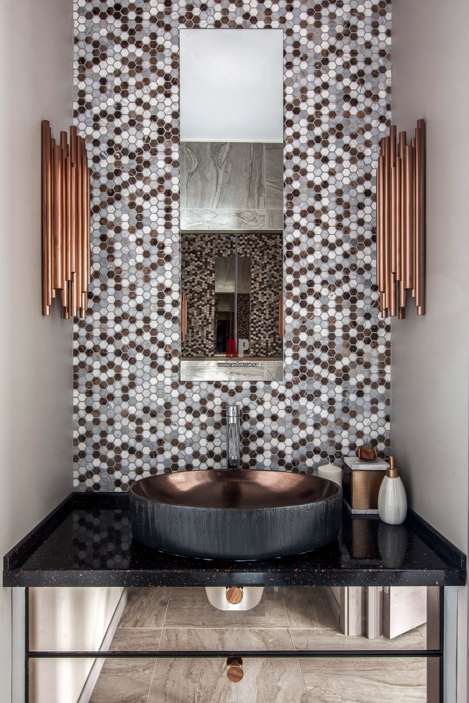 Интерьер одного из санузлов с отделкой стен каменной мозаикой и светильниками в стиле ар-деко. Зеркальное подстолье под раковину сделано на заказ.