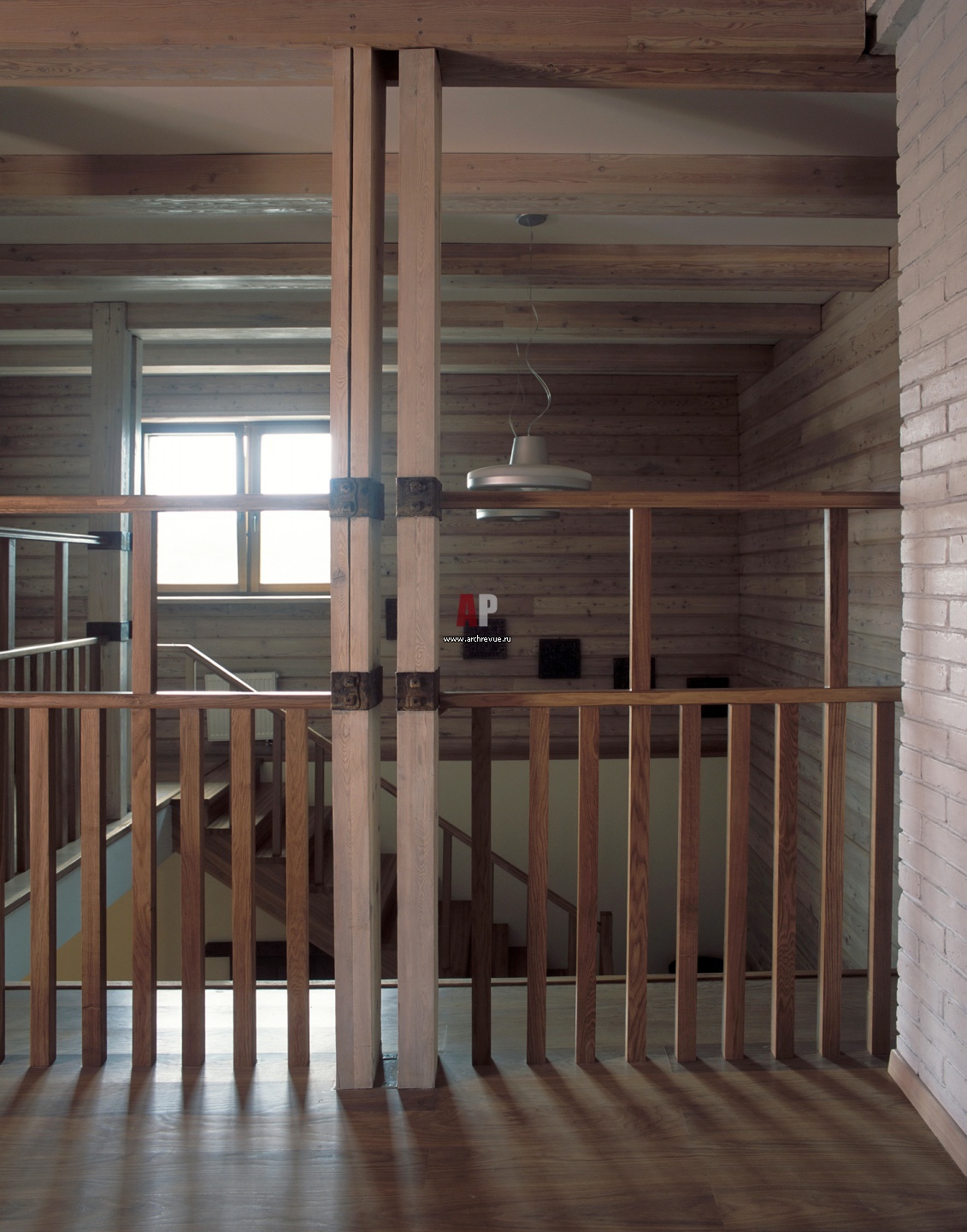 Фото лестничного ограждения в деревянном доме. Сопряжение двух материалов (дуба и панелей из выбеленной лиственницы) в лестничном ограждении обозначено декоративными элементами. Чтобы детали выглядели состаренными, их протравили раствором медного купороса.