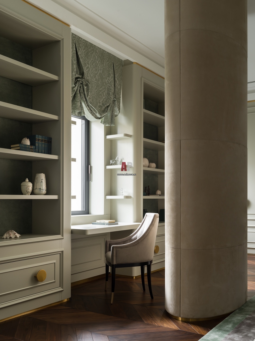 Туалетный столик в женской спальне. Помещение выполнена в теплой пастельной палитре.
