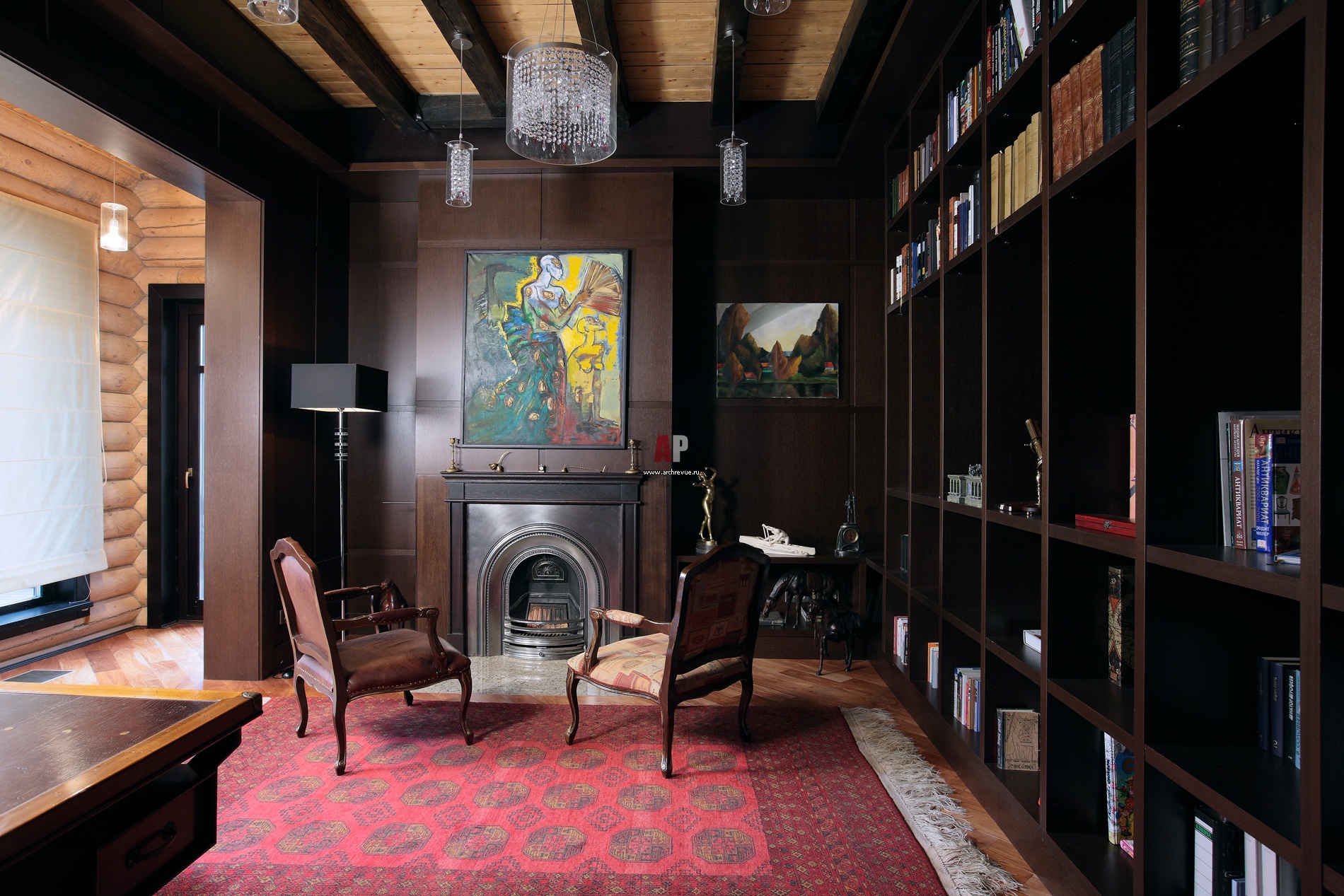 Фото интерьера каминной деревянного дома в современном стиле Фото интерьера библиотеки деревянного дома в современном стиле