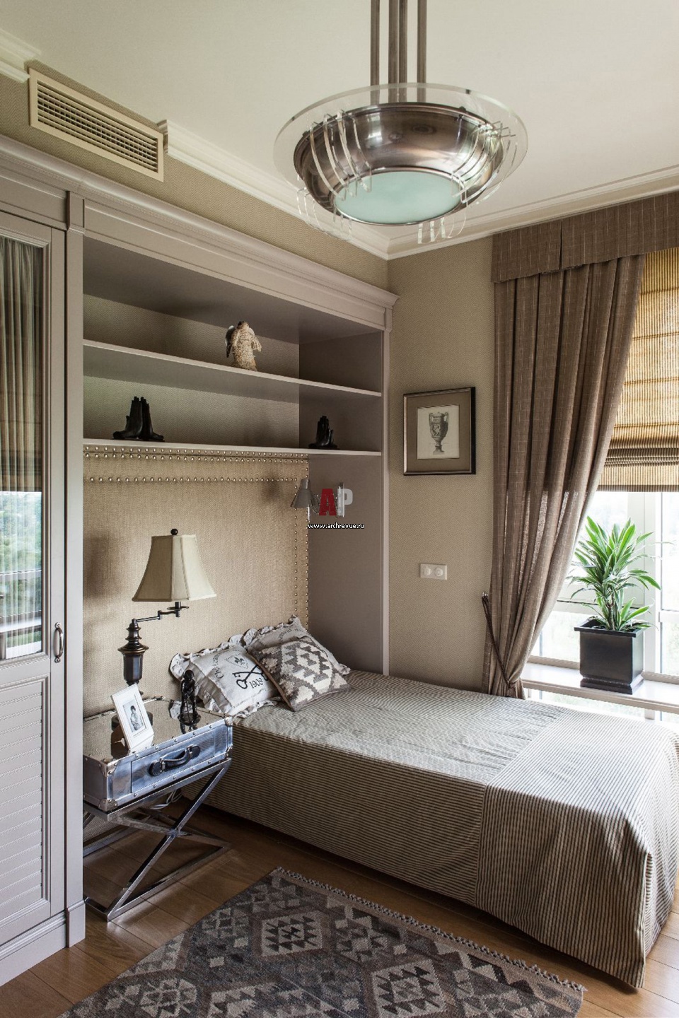Фото интерьера детской старшего сына. Кровать встроена в нишу, изголовье декорировано тканью бежевого цвета. На полу – традиционный иранский ковер – килим.