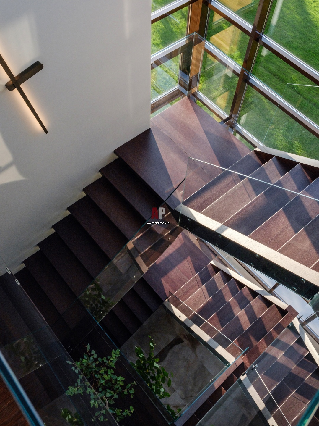 Двухэтажный дом с природными фактурами и атмосферой легкости. Лестничный холл.