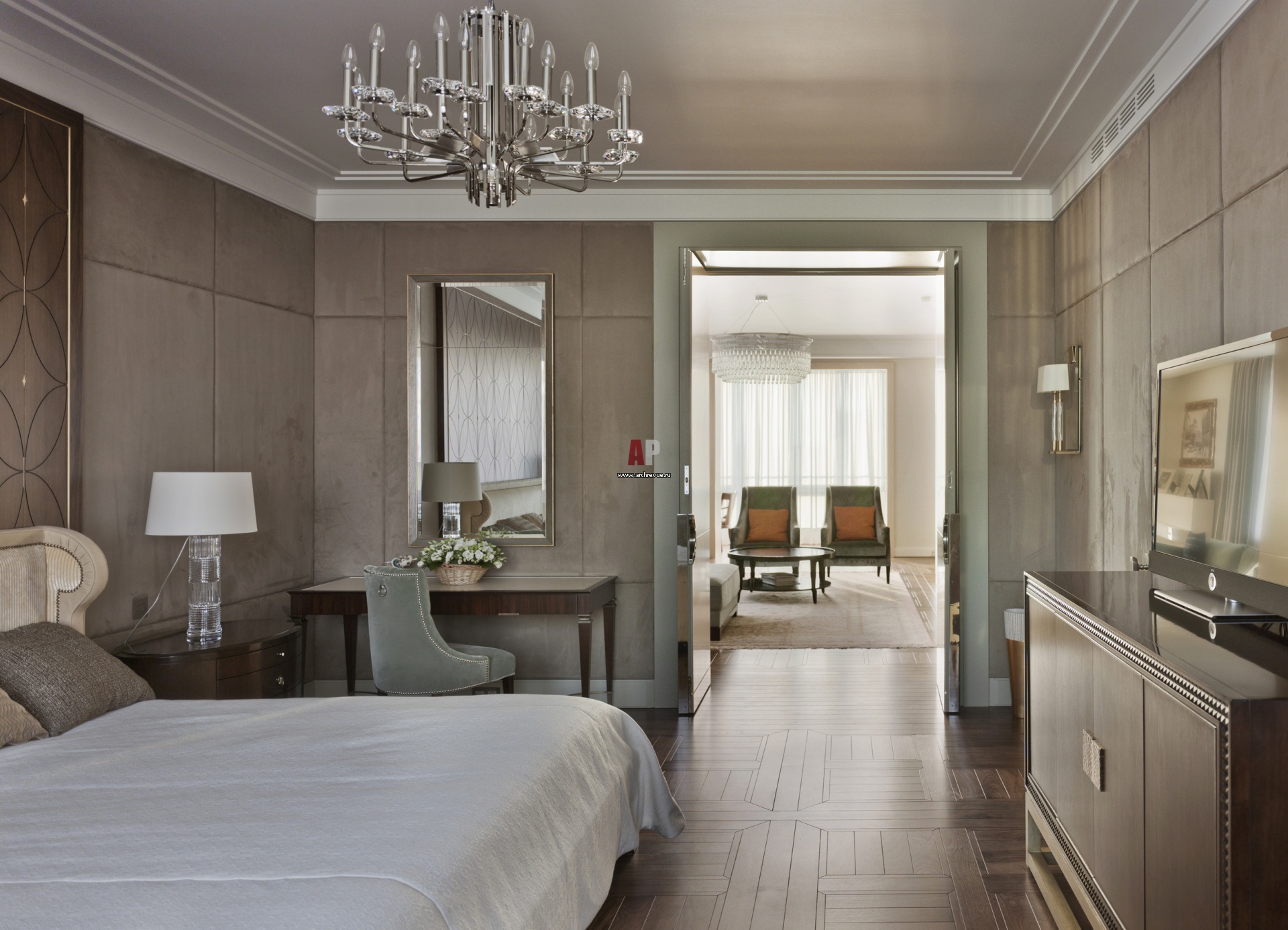 Стены спальни зашиты крупноформатными панелями из ткани с бархатистой фактурой оттенка кофе с молоком. Кровать, Galimberti Nino.