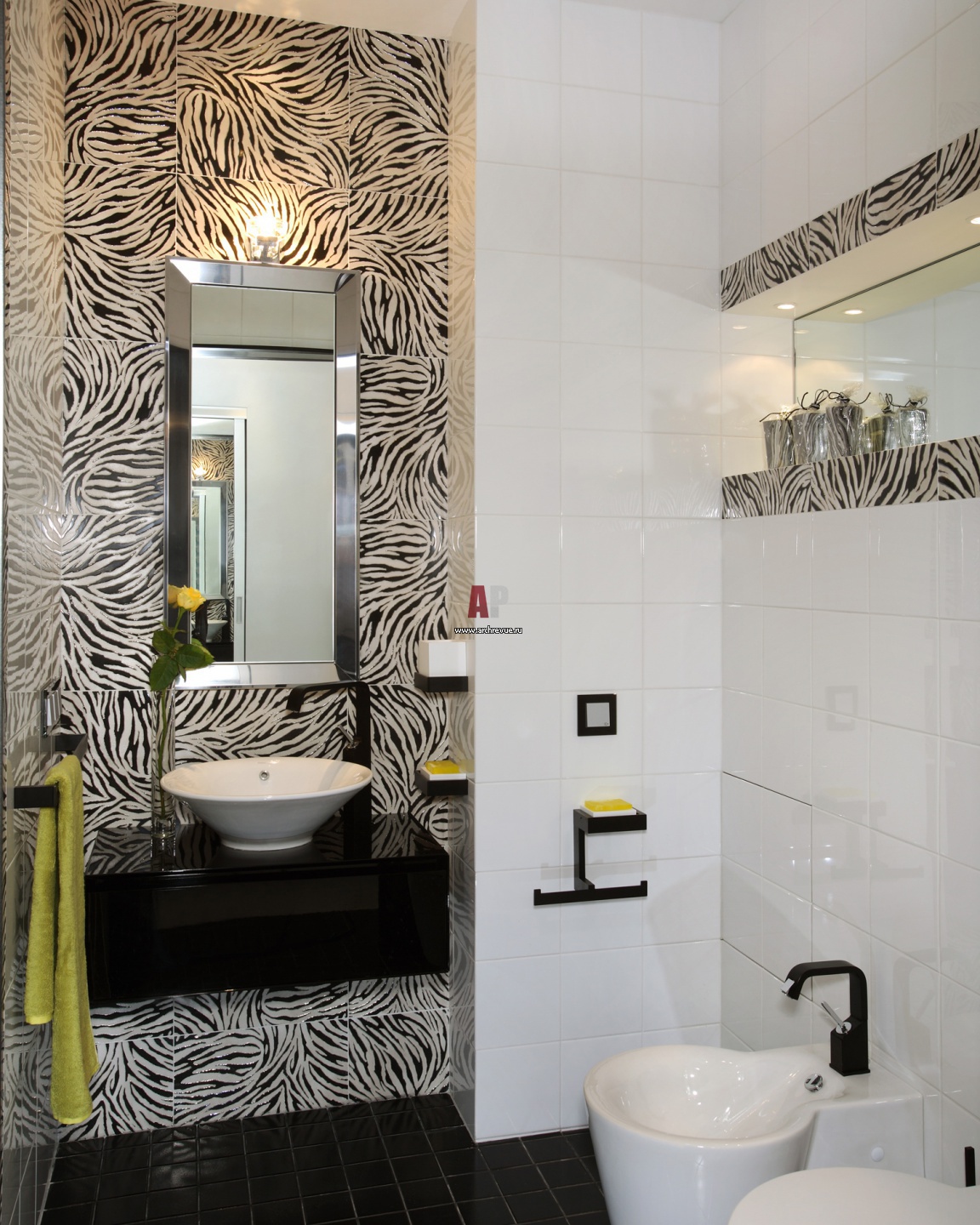 Гостевой санузел с этническими мотивами. Плитка «под зебру», поставщик «Нэксклюзив». Сантехника, Rifra.