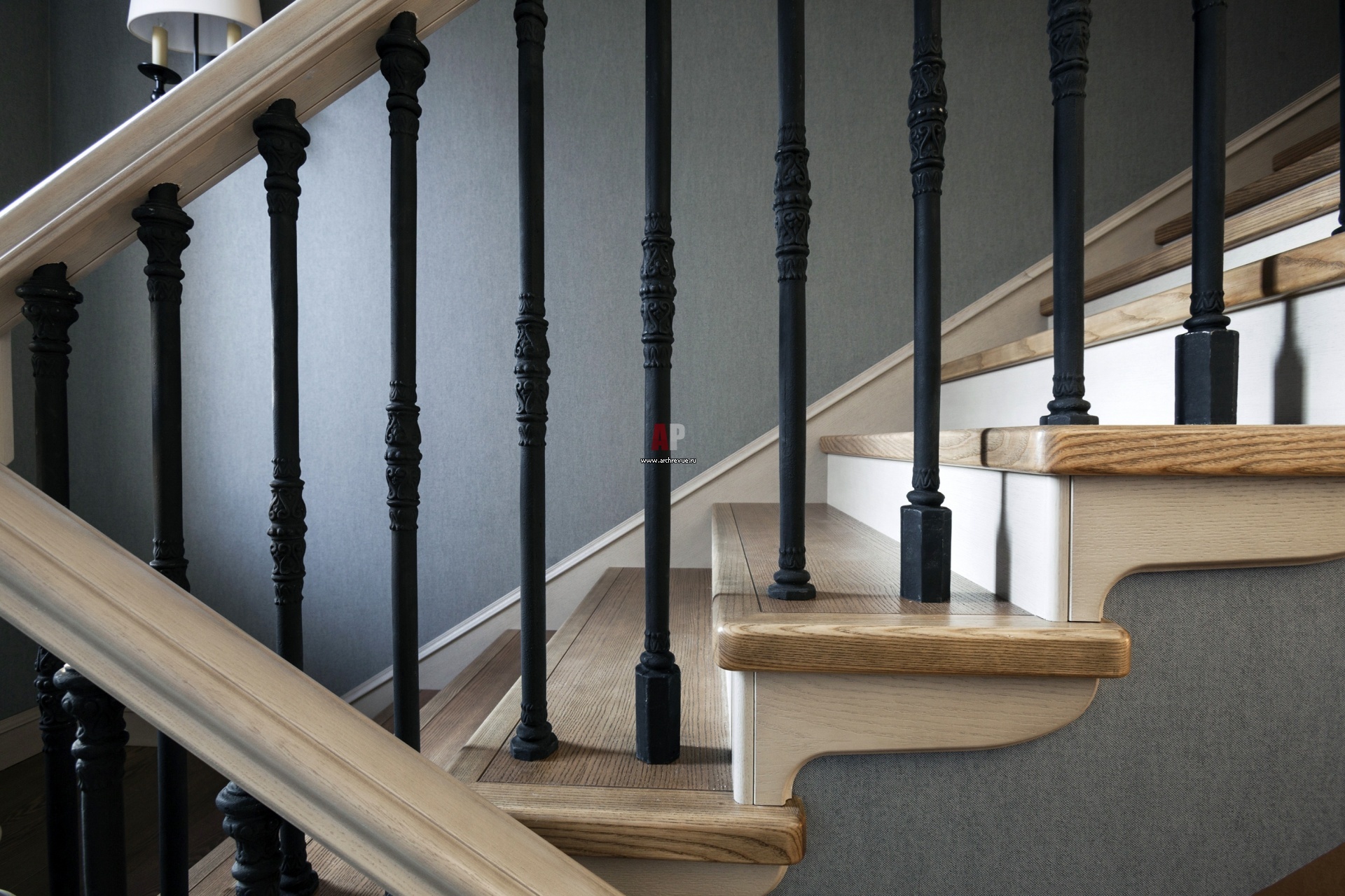 В оформлении лестницы сочетаются чугунные литые балясины и светлое дерево.