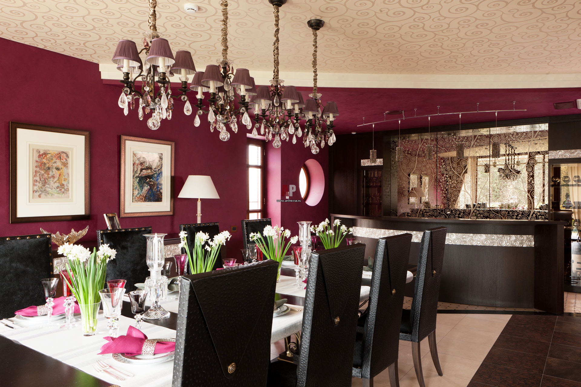 Кухня с барной стойкой выполнена по эскизам архитекторов на заказ. Полукруглая конструкция бара сделана из темного дерева, верхняя часть – бронзовое зеркальное панно с травлением. Декоративный фриз с орнаментом-завитками выполнен в технике альтокка и покрыт сусальным серебром.