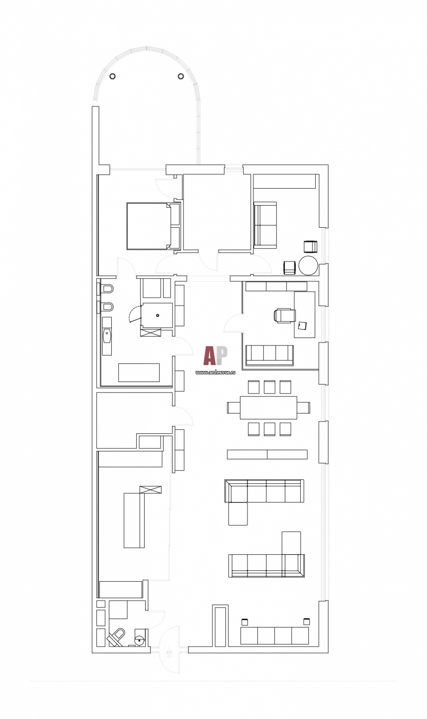 План кваритры в формы вытянутого прямоугольника. Общая площадь: 220 кв. м.