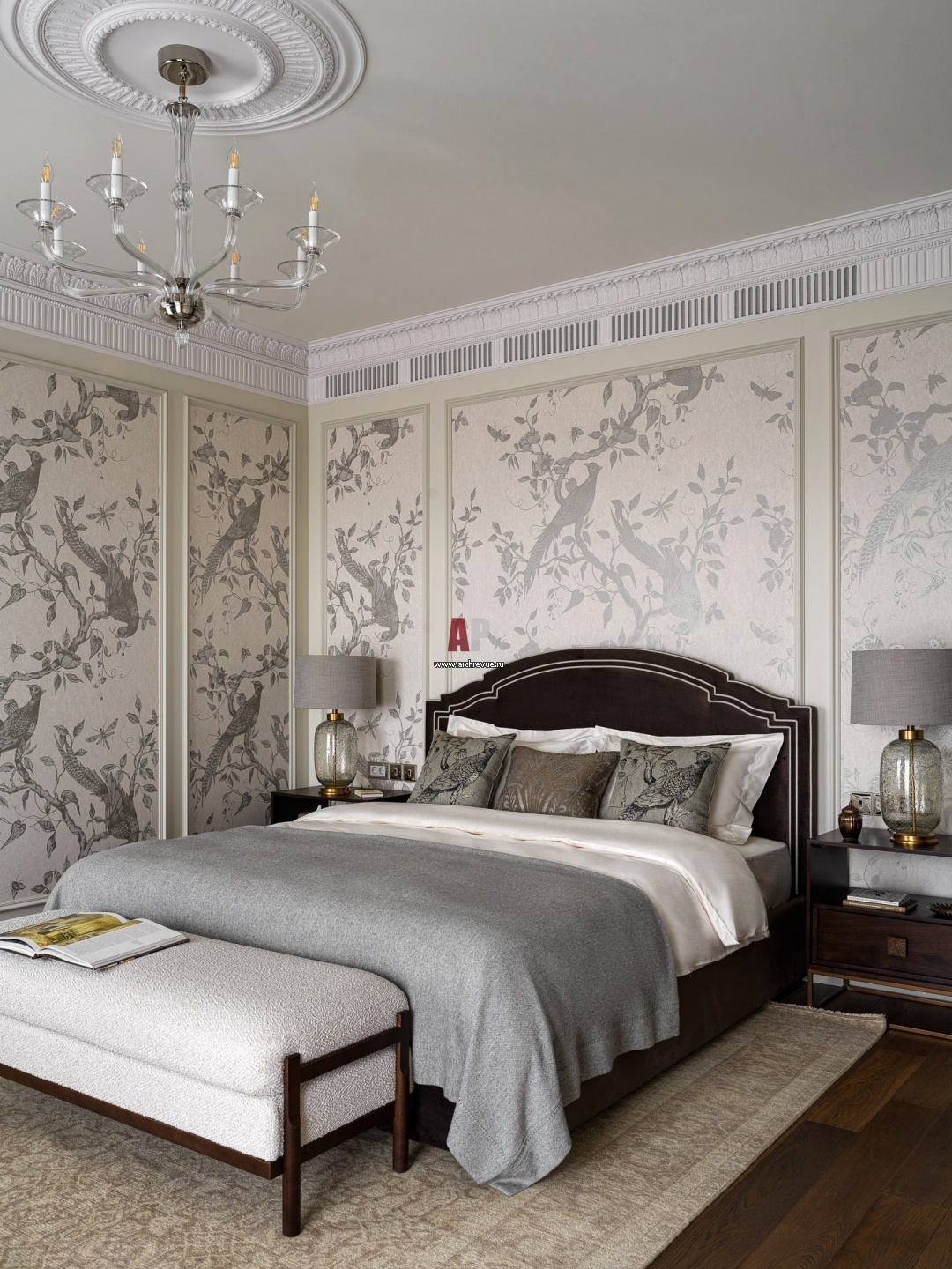 Парадная неоклассика в Санкт-Петербурге. Интерьер гостевой спальни. Стены оформлены обоями с сюжетом из растительного и животного мира и обрамлены гипсовым багетом.
