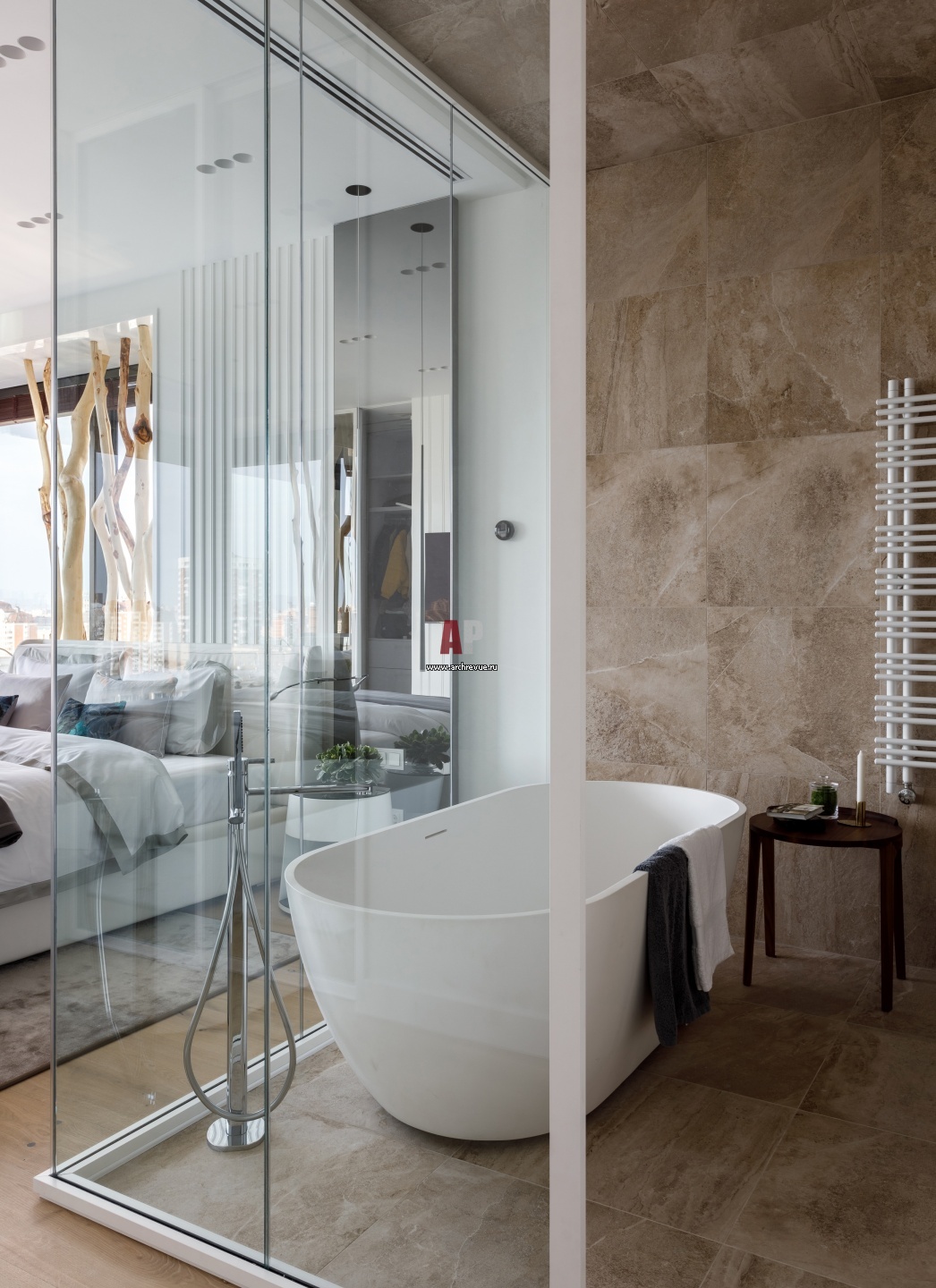 Стеклянный куб с ванной в хозяйской спальне. Пол, стены, керамогранит, Rex.
