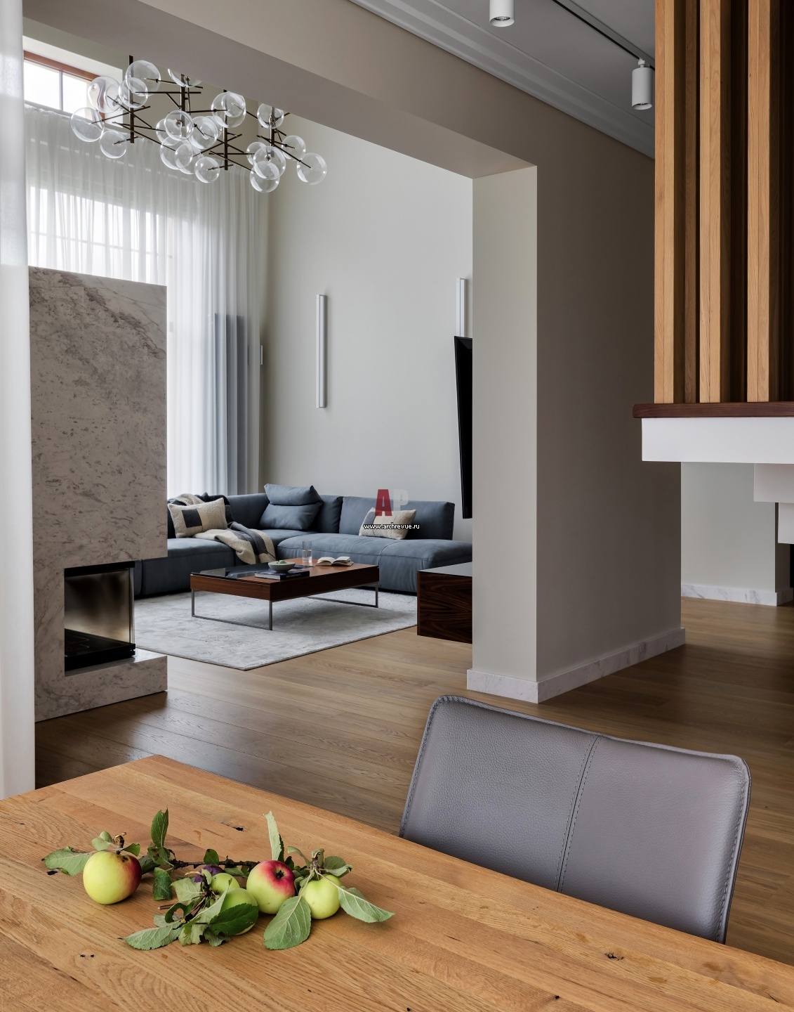 Вид из столовой на гостиную. Столешница обеденного стола, массив дуба.