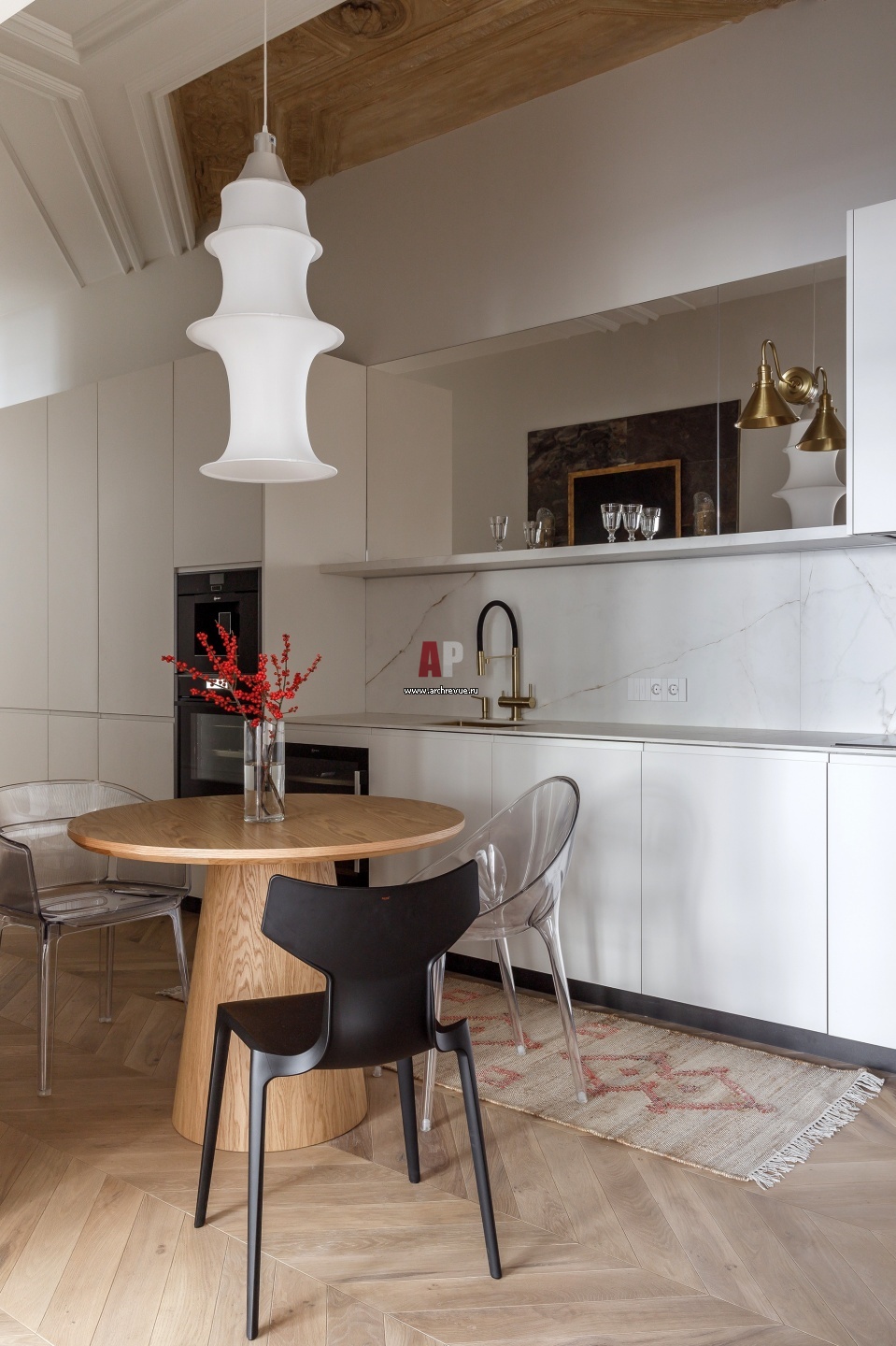 Кухня с зоной для завтраков. Кухня, Gamadecor. Стулья, Kartell. Обеденный стол, на заказ. Подвесной светильник над столом, Artemide, модель Falkland.