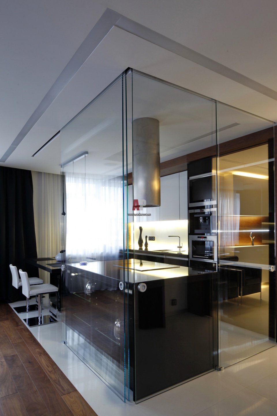 На полу кухни – крупноформатный белый глянцевый керамогранит.