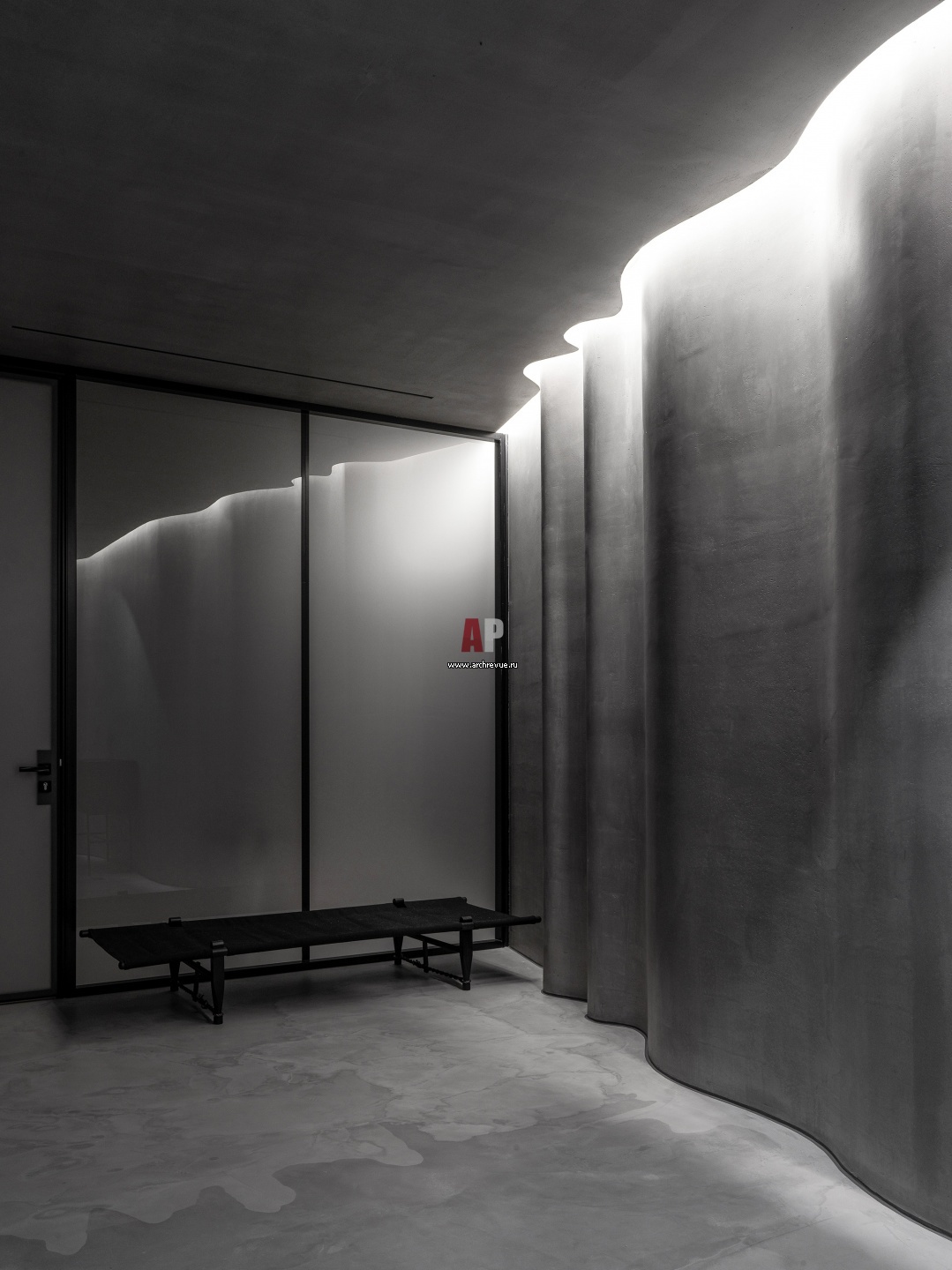 Массажная. Волнообразная стена из бетона с верхней контурной подсветкой– акцент пространства.