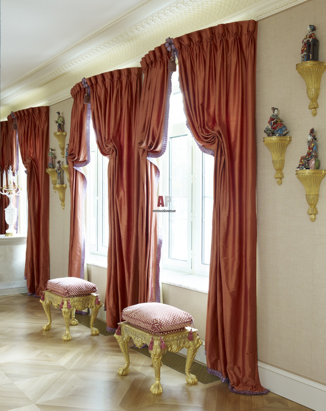Парадный текстильный дизайн окон. Портьеры: шелк от Highland Court; плиссированный кант из шелка от Scalamandre, декоративная тесьма по дизайну XVIII века. Банкетки, английский дизайн XVIII века, обивка от Scalamandre.