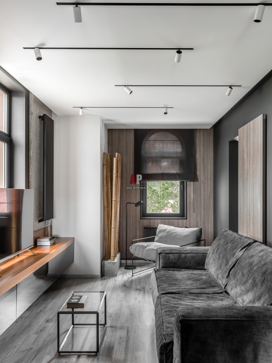 Из-за формы квартиры кухня-гостиная получилась вытянутой. Эту особенность пространства использовали для того, чтобы линейно разместить все функциональные зоны: кухню, столовую, гостиную, зону отдыха у окна.