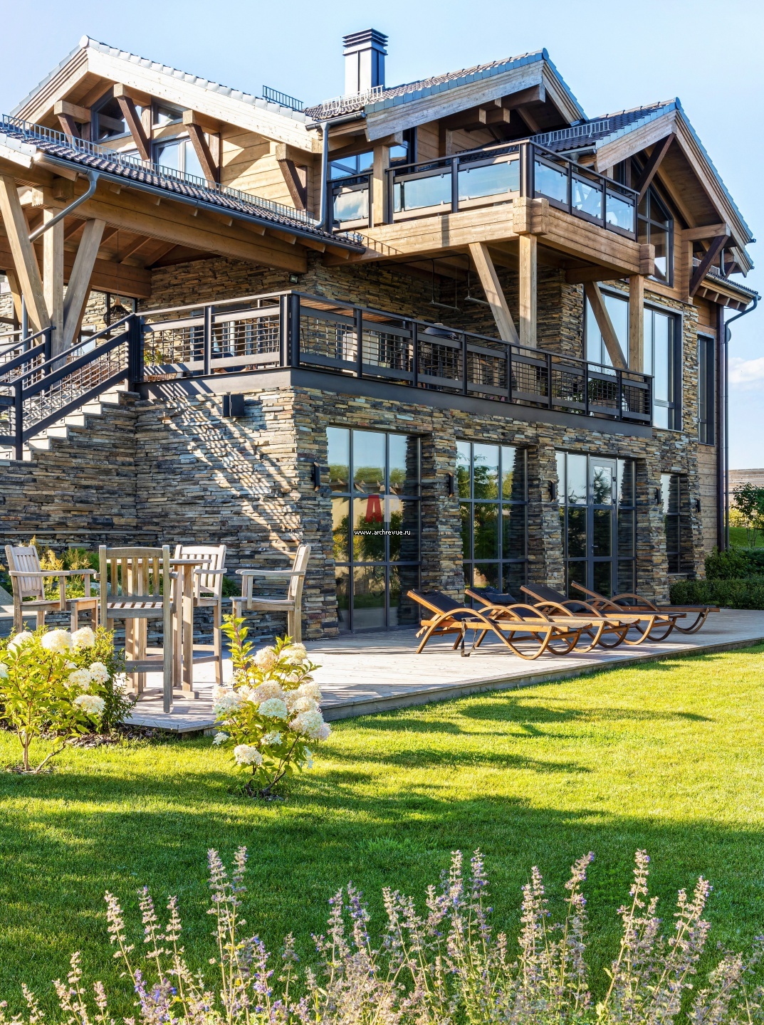 Трехэтажный дом построен из бетона и клееного бруса сосны. Фасад отделан брутальным шунгитовым сланцем. Перед домом – дощатый настил и открытая терраса.