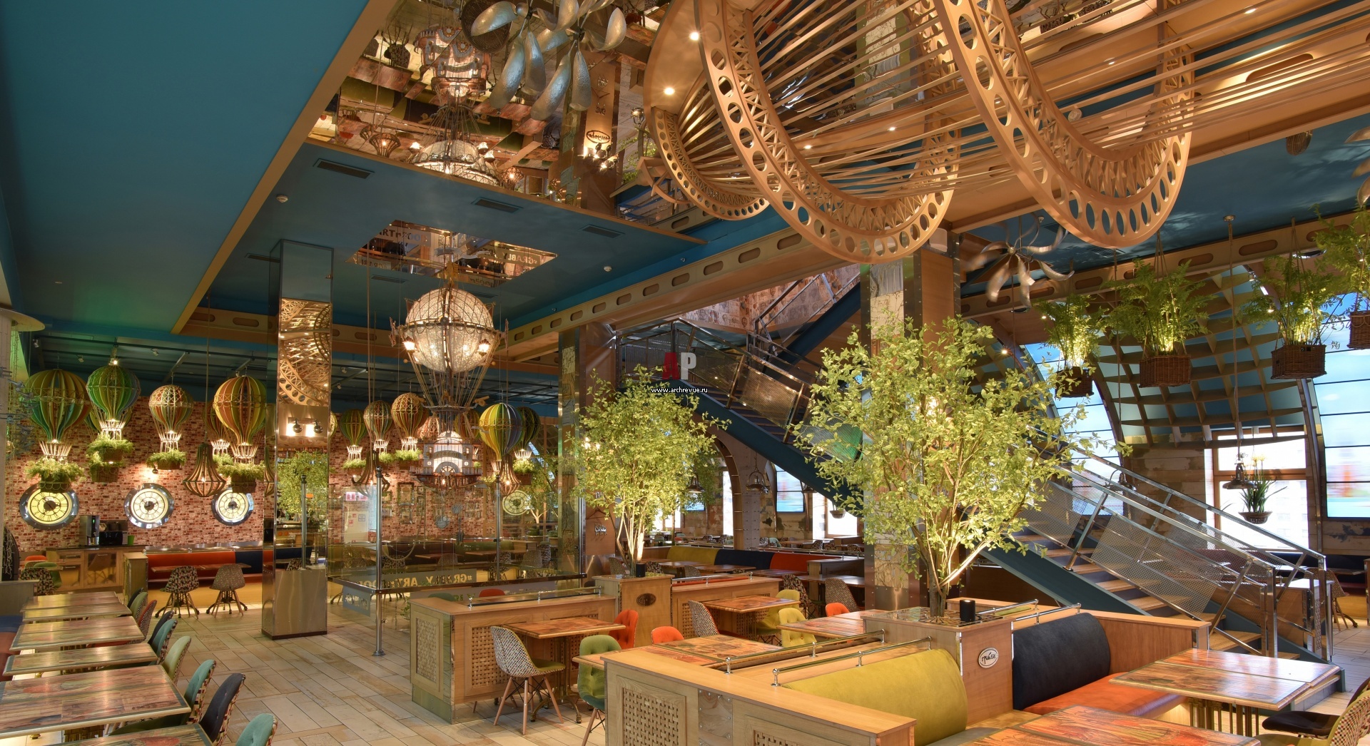 За дирижаблем находится игрушечный воздушный шар – мобильная конструкция, которая постоянно перемещается между первым и вторым этажом. Шар с населенной сказочными существами гондолой создан Алёной Табаковой совместно с художником Анатолием Титовым.