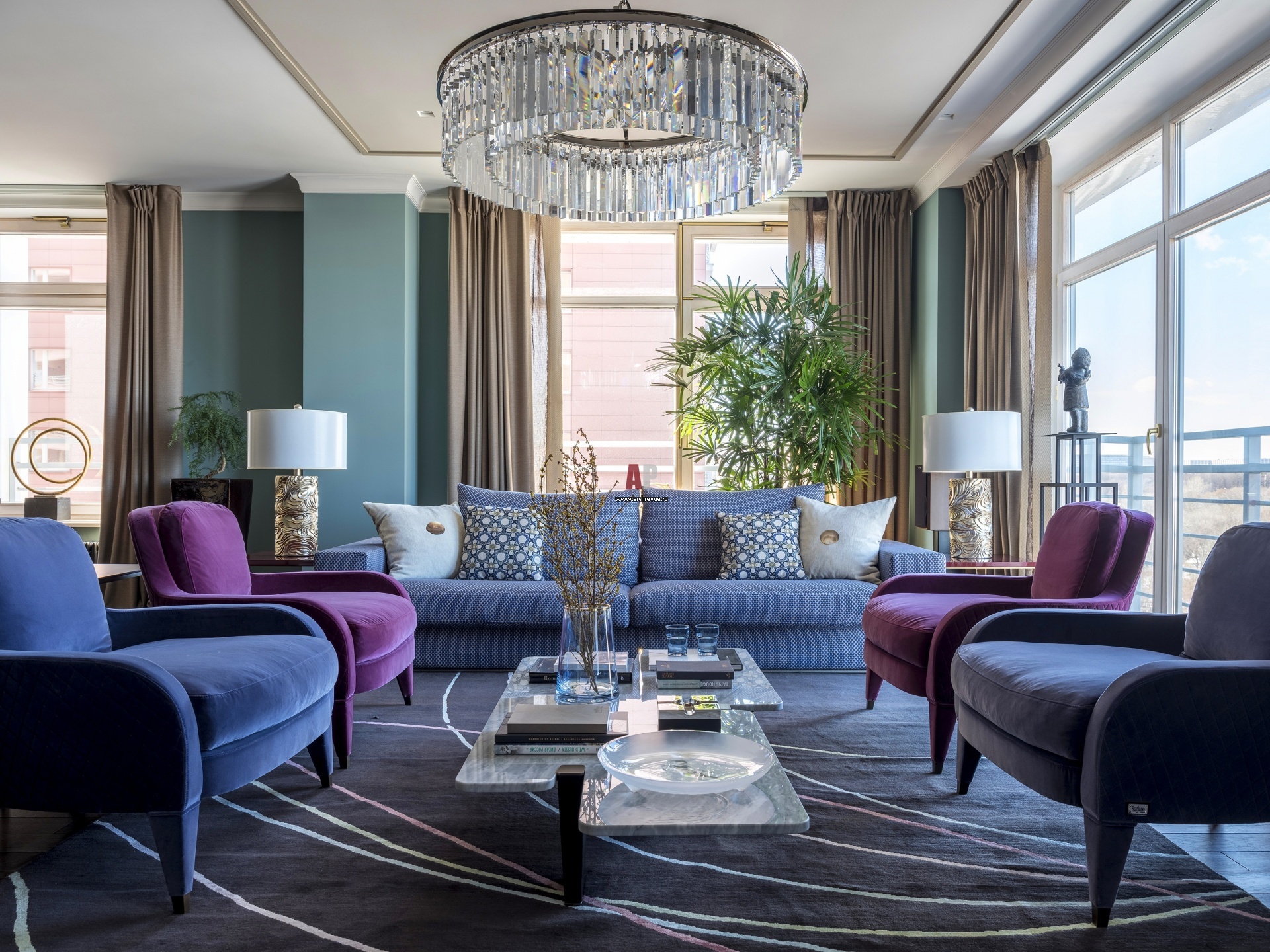 Мужская квартира в насыщенной цветовой гамме. Диван, Flexform, модель Magnum в ткани Holland & Sherry. Журнальный стол, Minotti, модель Jacob. Кресла, Rugiano, модель Emma. Круглый потолочный светильник, Restoration Hardware.