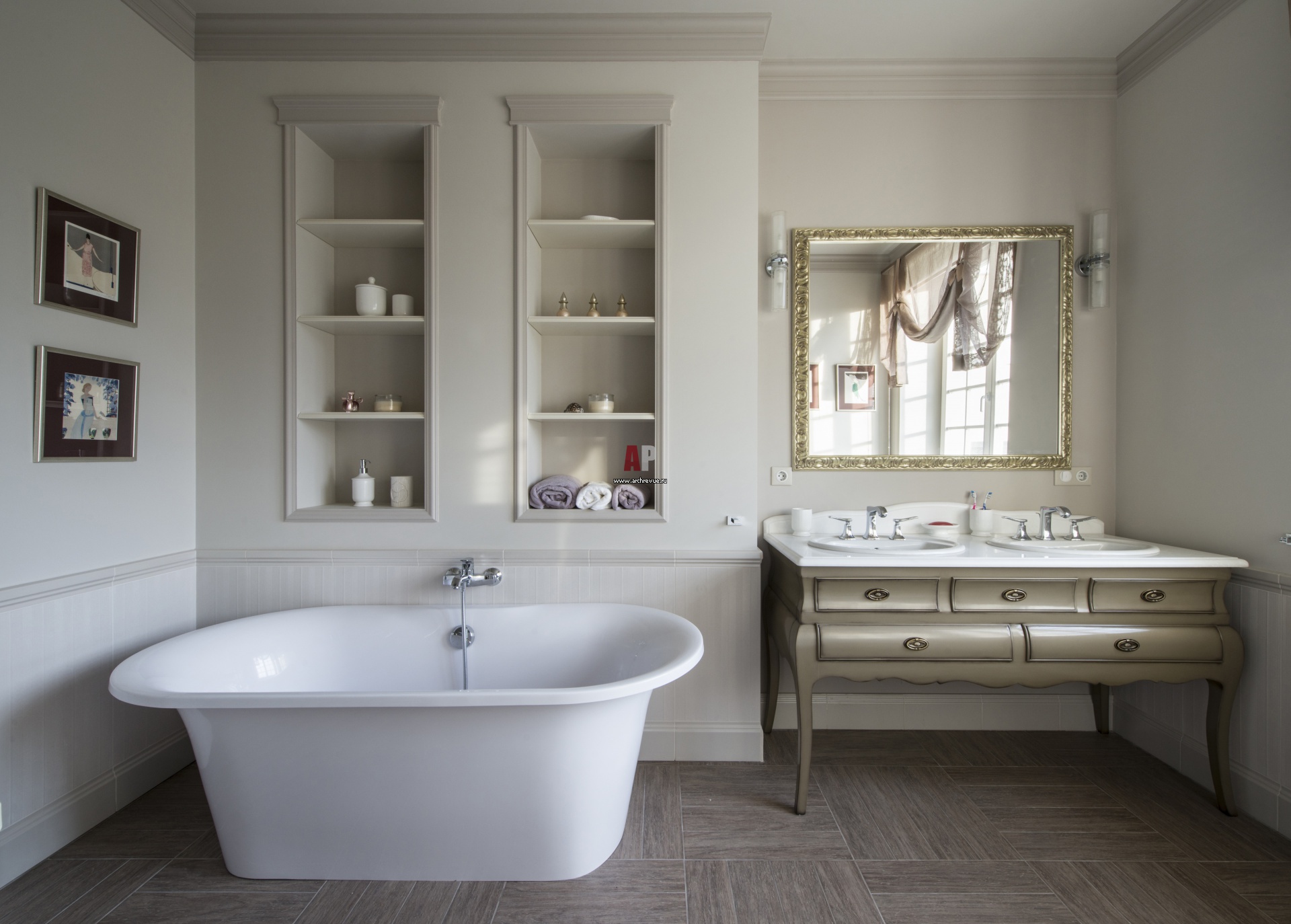 Ванная комната с окном при хозяйской спальне. Консоль под раковину, Giorgio Piotto. На полу – керамогранит с фактурой дерева.