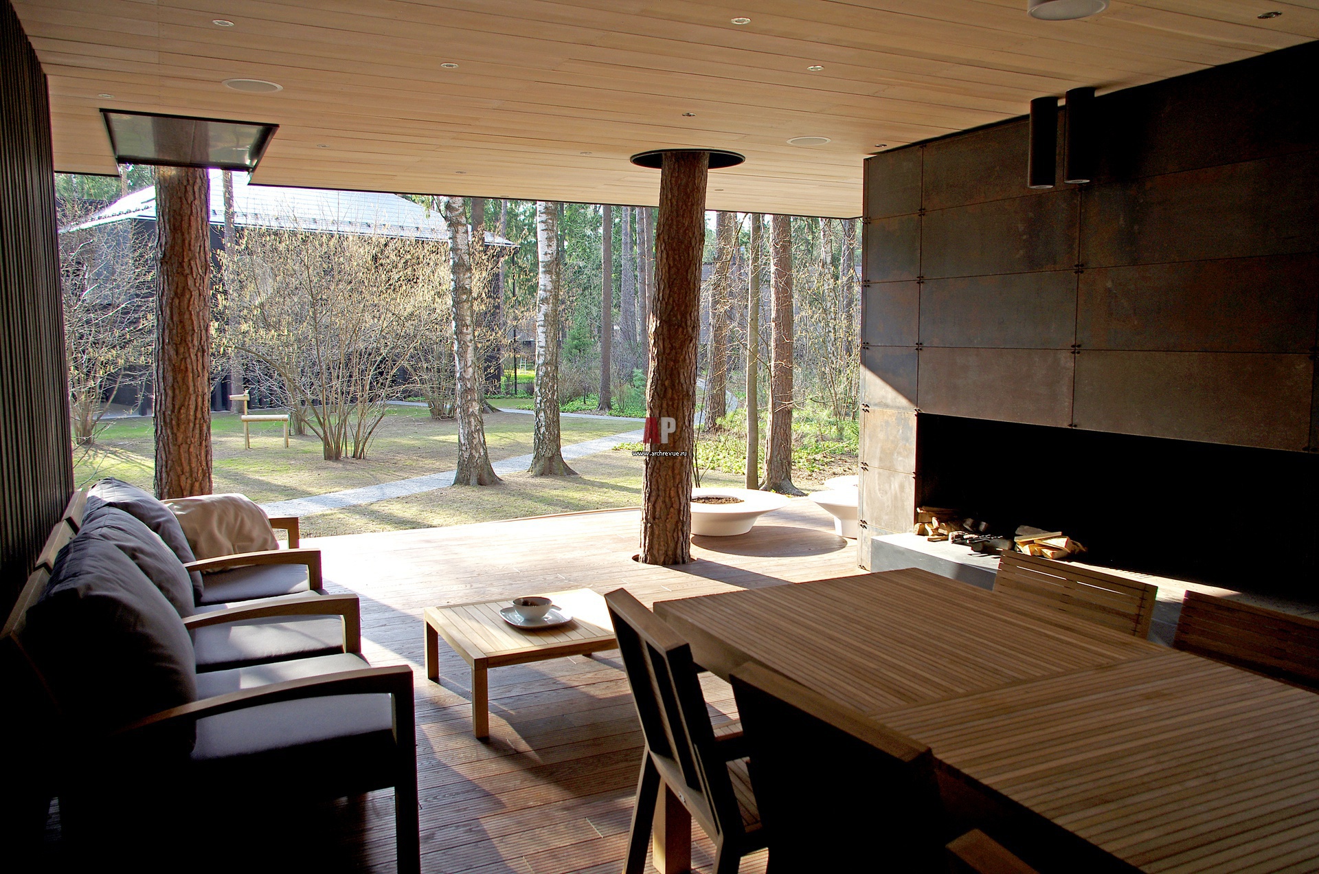 Интерьер столовой зоны на веранде. Чтобы сохранить деревья на участке, их сделали частью архитектуры. Стволы сосен «прорастают» сквозь плоскую кровлю построек. Изнутри вынос кровли подшит деревянной доской.