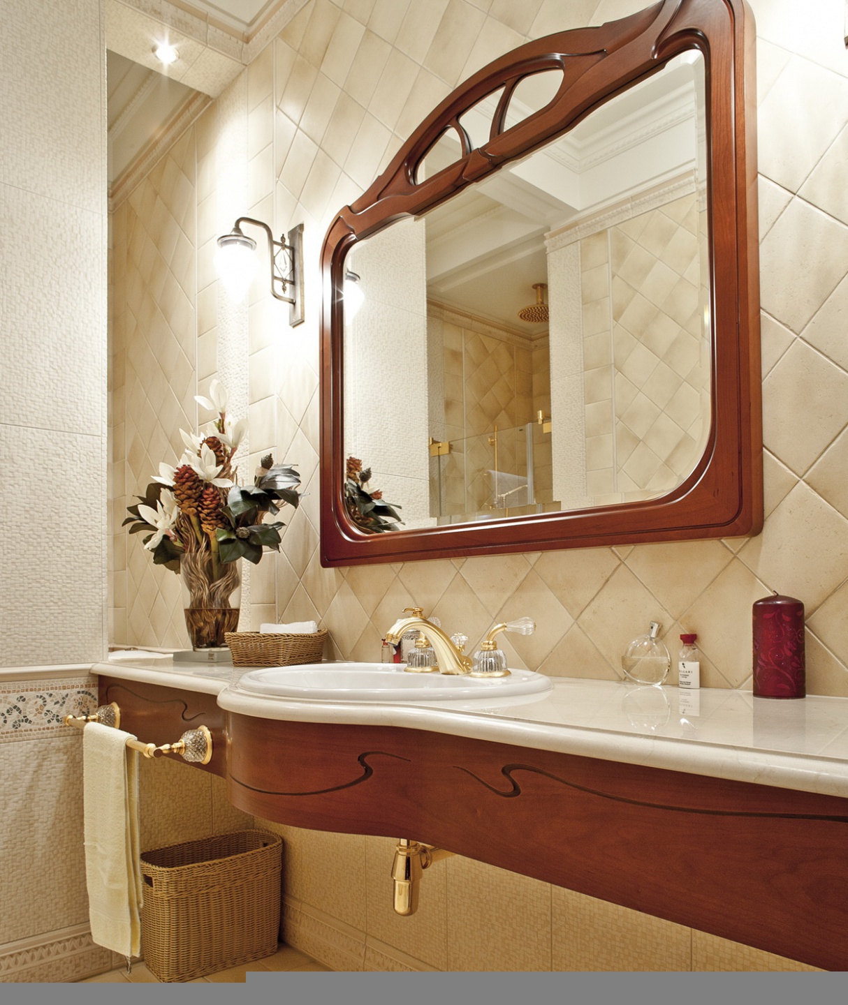На фото – интерьер гостевого санузла. Волнообразное подстолье для раковины и зеркало выполнены на заказ из тонированной вишни, изготовление «АФ Ника».