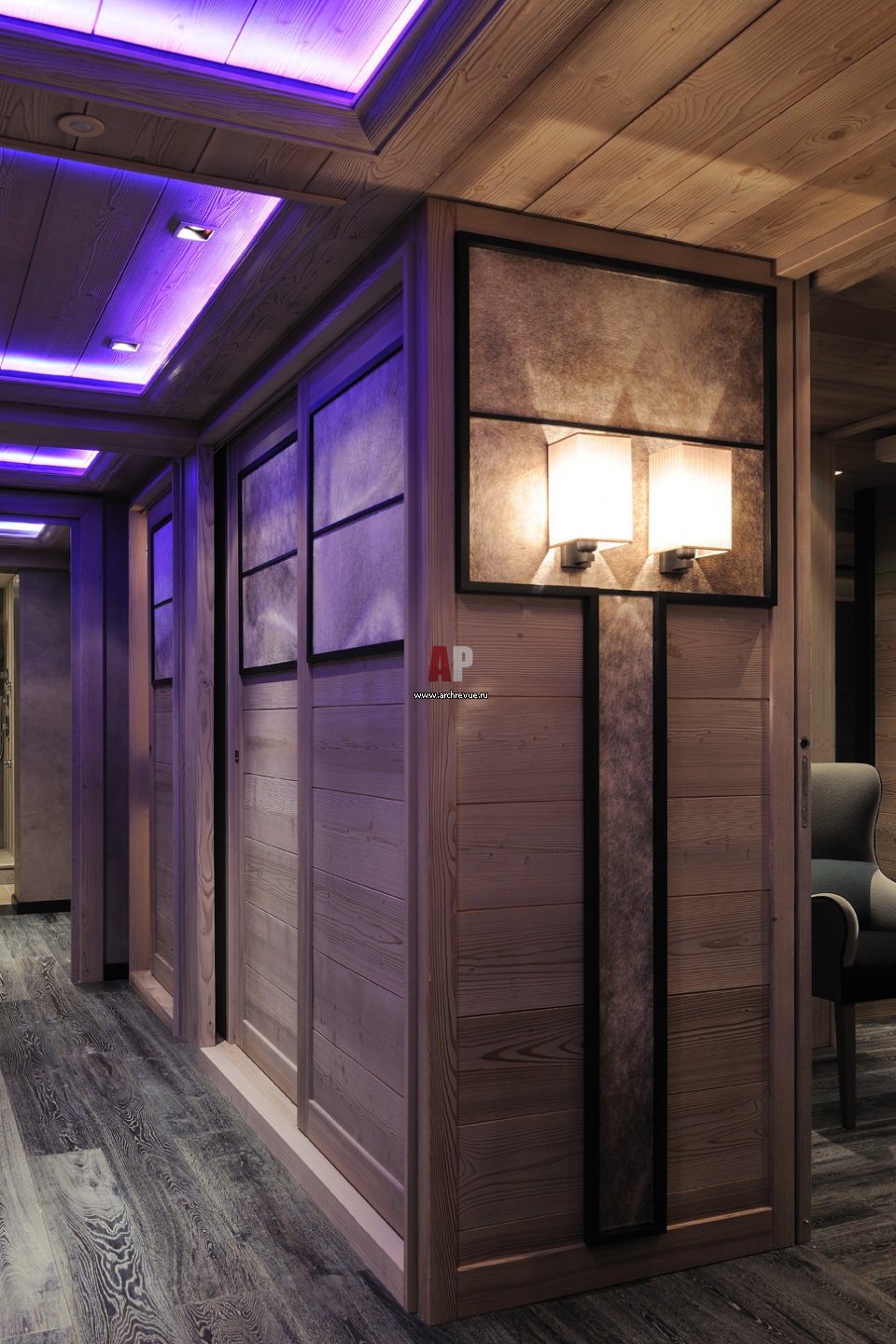 Холл в номере отеля зашит деревянными панелями из дуба. Оформление торцевой стены панелями из шкуры пони с двумя симметричными бра напоминает торшер.