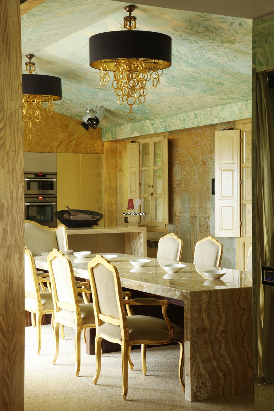 Дизайн интерьера столовой вдохновлен итальянским искусством. Обеденный стол из оникса.