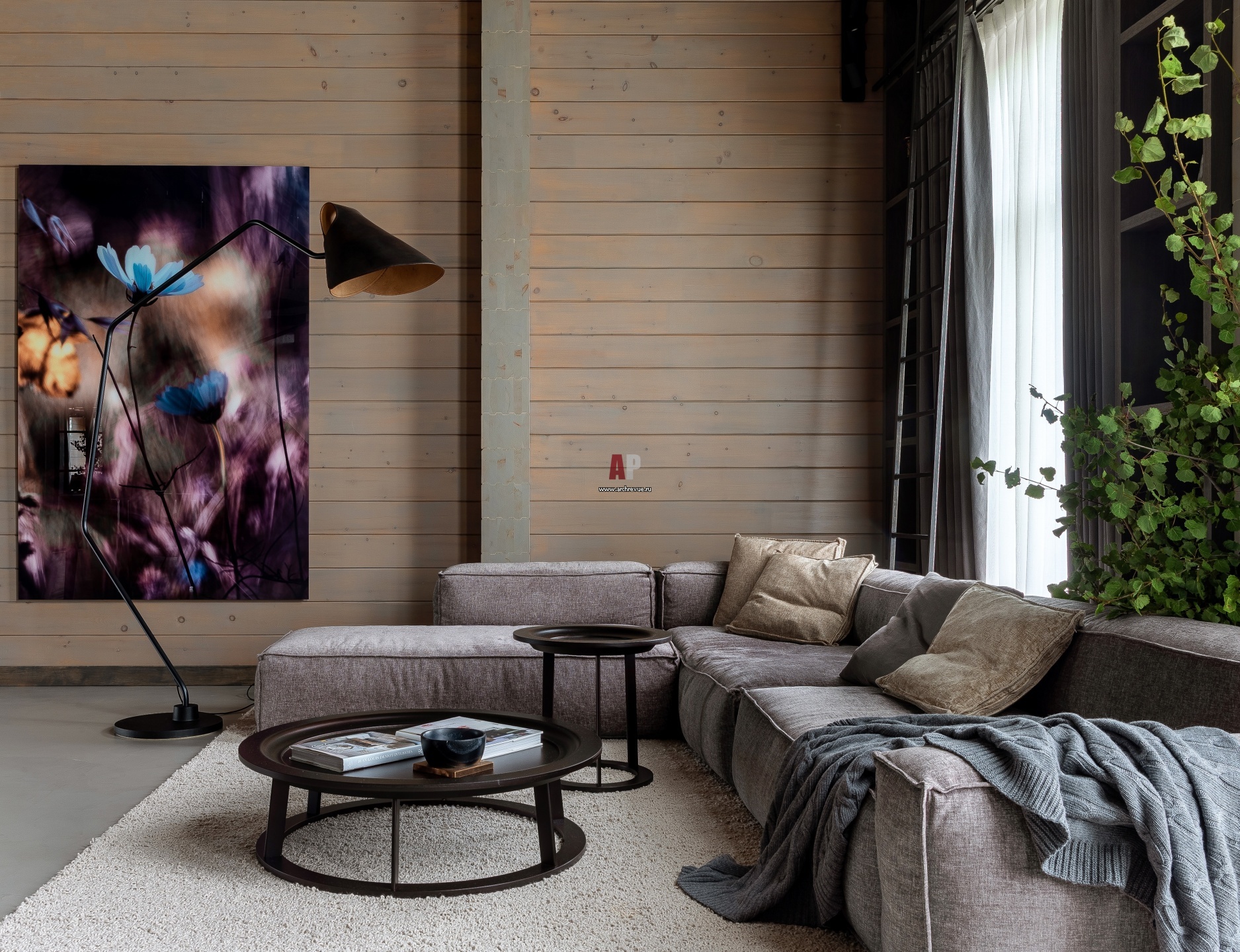Деревянная усадьба на Алтае. Интерьер гостиной в двухсветном пространстве.