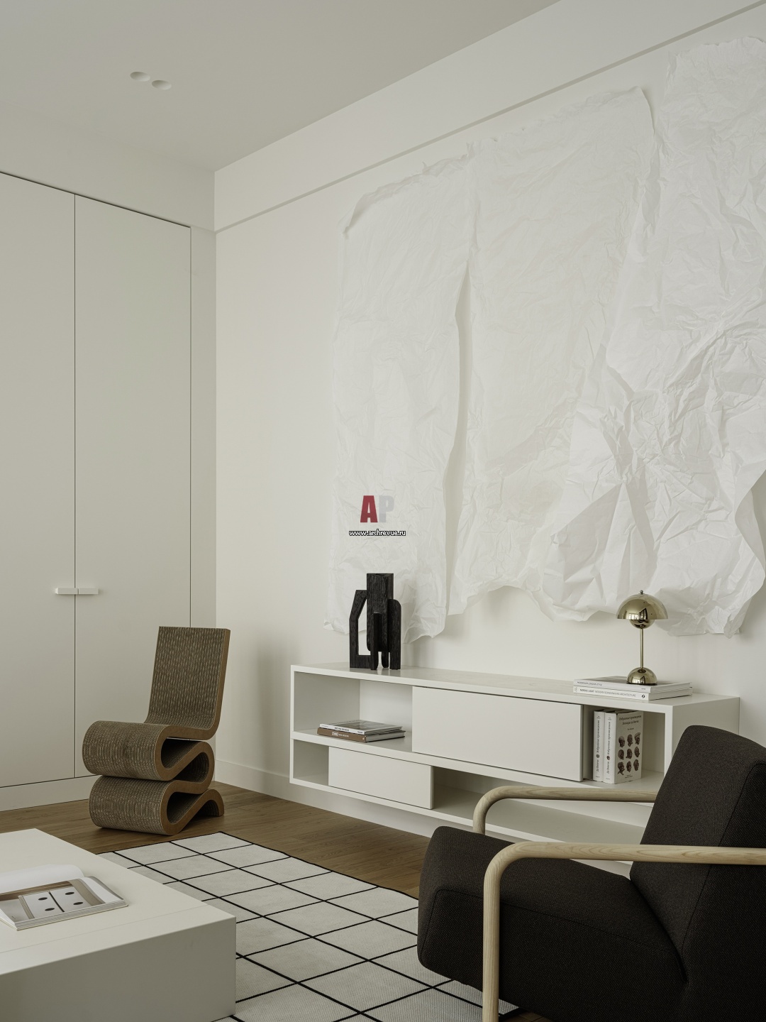 Почти вся мебель в квартире сделана на заказ. ТВ-тумба, диван, журнальный столик, на заказ, по эскизам дизайнеров. Лампа, &Tradition.