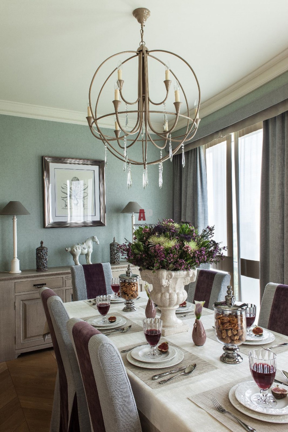 Фото интерьера парадной столовой в жемчужно-бирюзовых тонах.