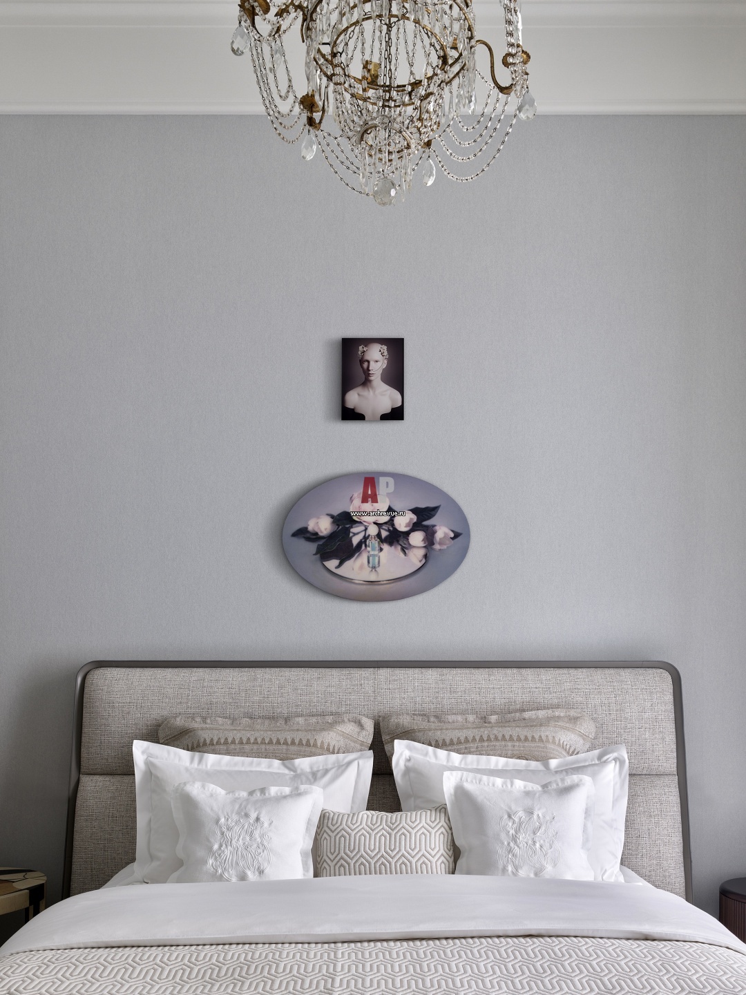 Мастер-спальня оформлена в прохладной палитре. Над изголовьем кровати две работы Олега Доу.
