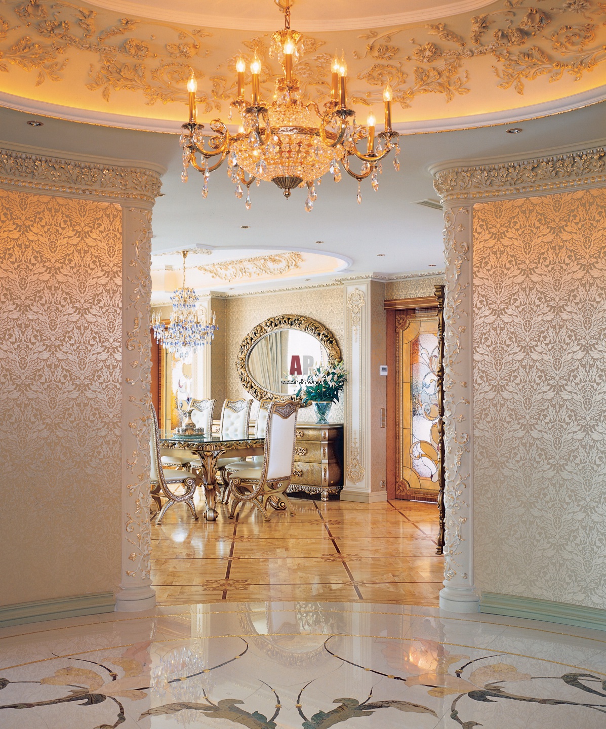 Парадна входная зона с круглым холлом и открытым широким проемом в общественную зону. Лепной декор из гипса в отделке карнизов, потолков, пилястр выполнен по эскизам автора проекта.