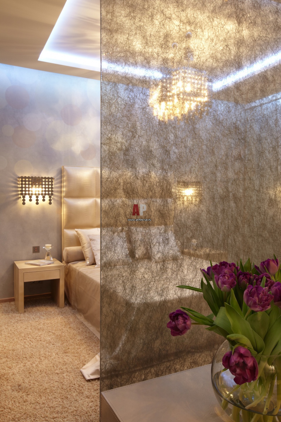 Вид из кабинета на спальню. Между стеклами перегородки вставлена ткань с эффектом муара, изготовление «Атлантик-СТ».