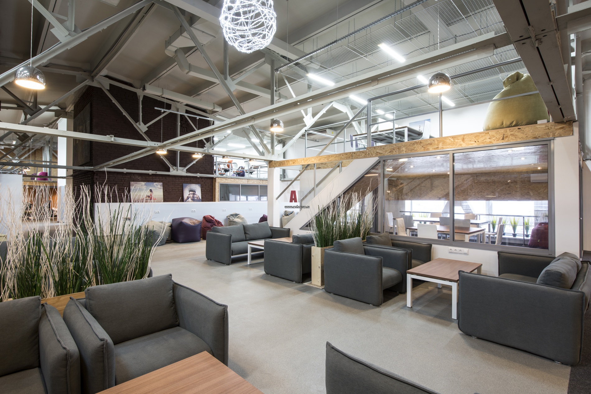 В отделке лофта использован фабричный кирпич, пробковое покрытие, плиты из прессованной стружки без финишной отделки и коммерческий линолеум.