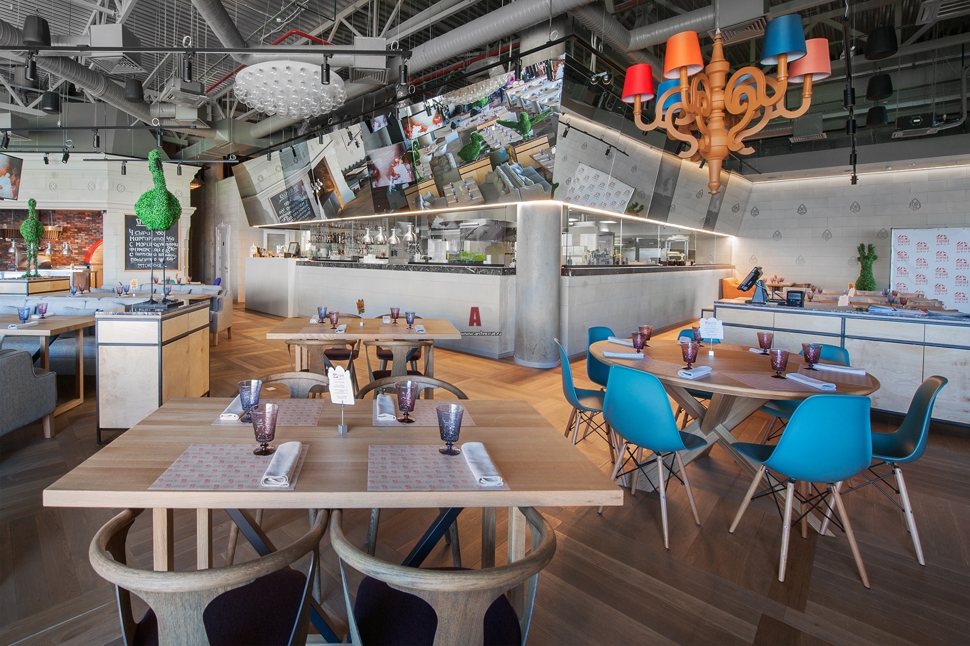 Столы открытой кухни и кухонная стойка сложены из пеноблоков, сверху они накрыты мраморными столешницами. На полу кухни – бетон с каменной крошкой, в зале – сосновый паркет: недорогие, но визуально благородные материалы.