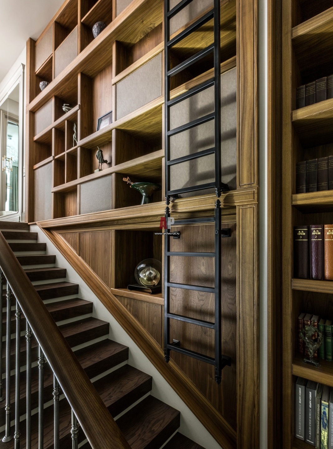 Лестница со встроенной библиотекой. Лестница и стеллажи выполнены на заказ из шпона ясеня, массива дуба, металла и кожи. Верхняя часть вертикальной лестницы легко перемещается по специальным закладным, обеспечивая легкость доступа к самым верхним местам хранения. Скульптуры Андрея Марца.