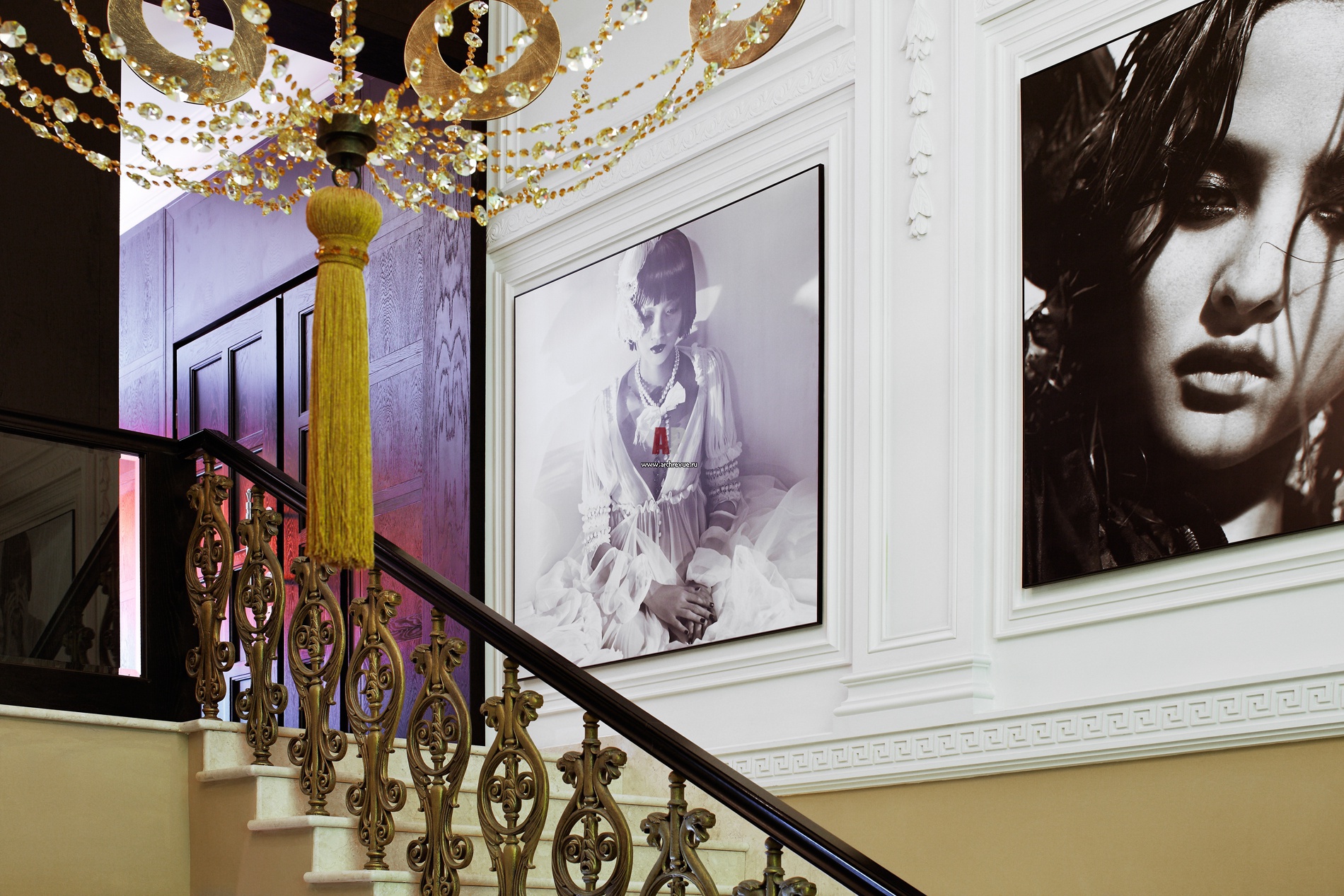 Лепной декор на стенах и кованое ограждение лестницы аутентичные, они изначально присутствовали в здании и были тщательно отреставрированы.