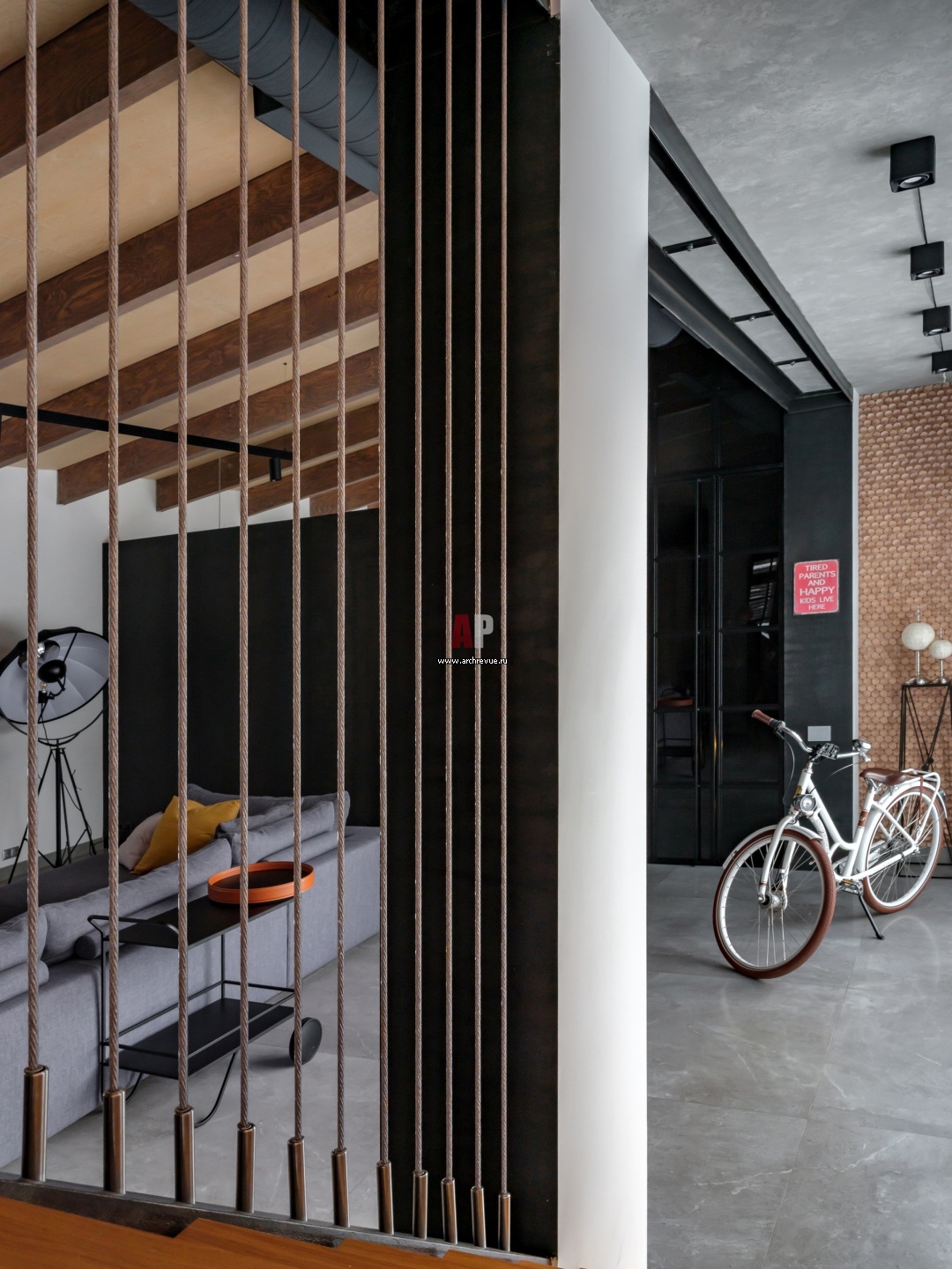 Ограждение лестницы со стороны гостиной представляет собой тросы в силиконовой оплетке.