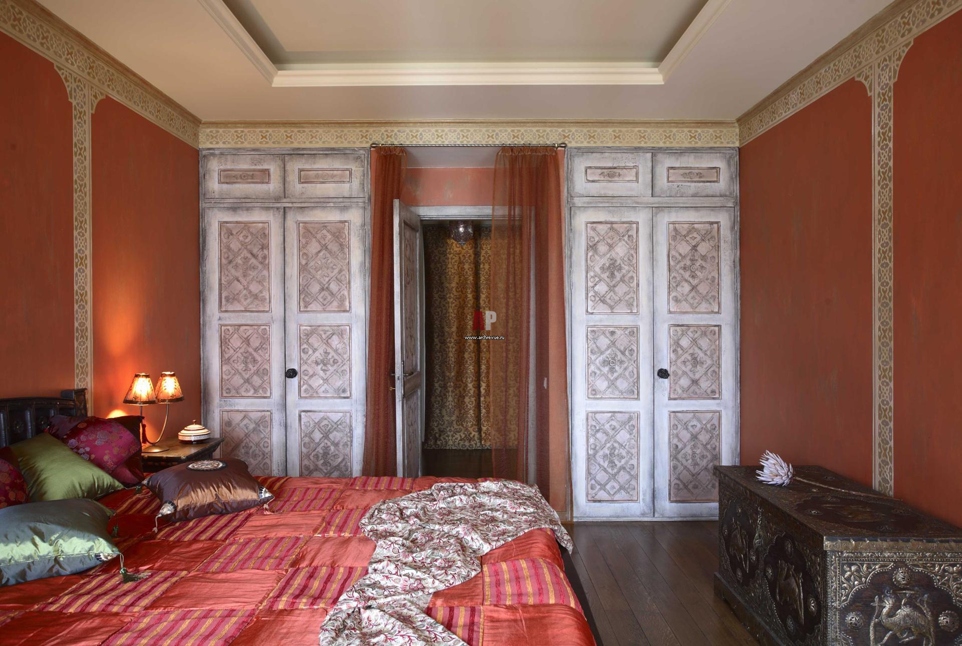 Главное украшение спальни – вырезанный вручную и покрытый патинированными финишами портал гардеробных «Техноформ». С ним гармонично смотрится текстиль NF-studio и мебель из Индии, поставщик «Альвин».